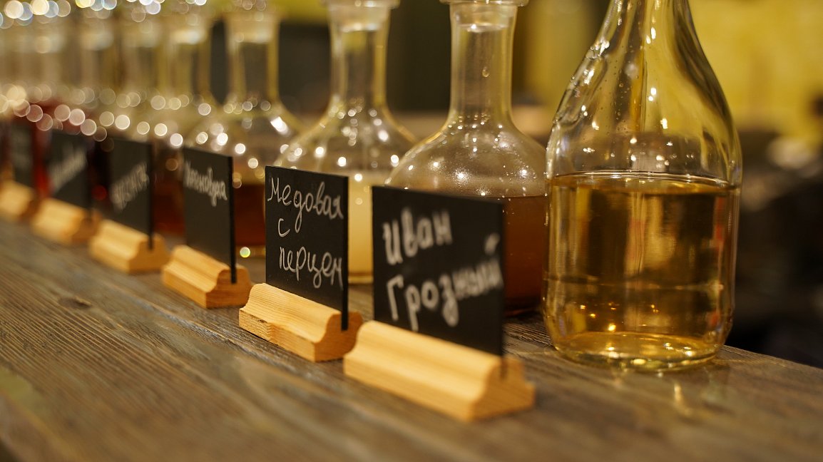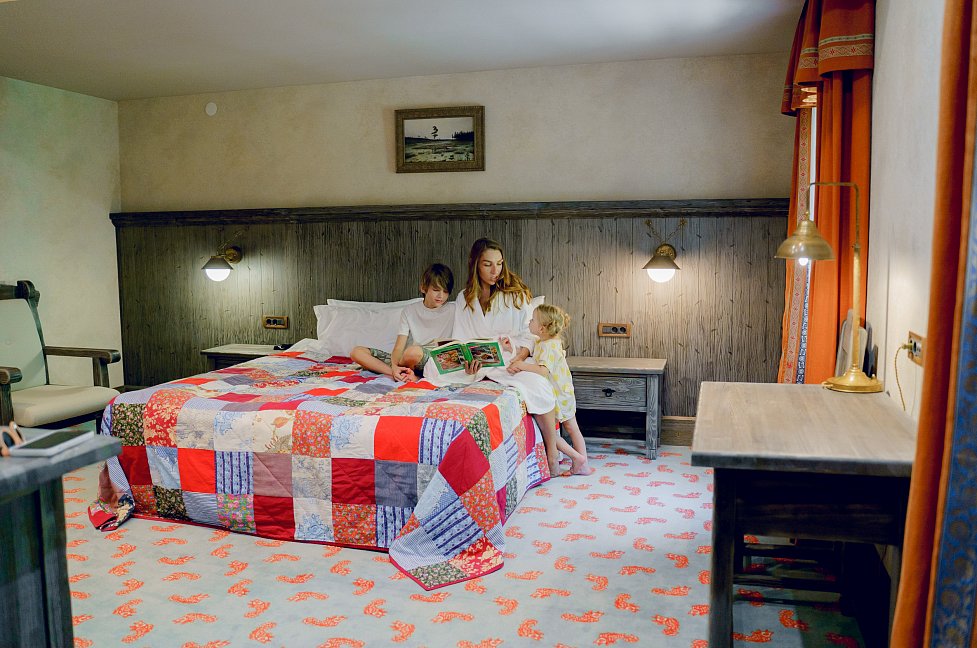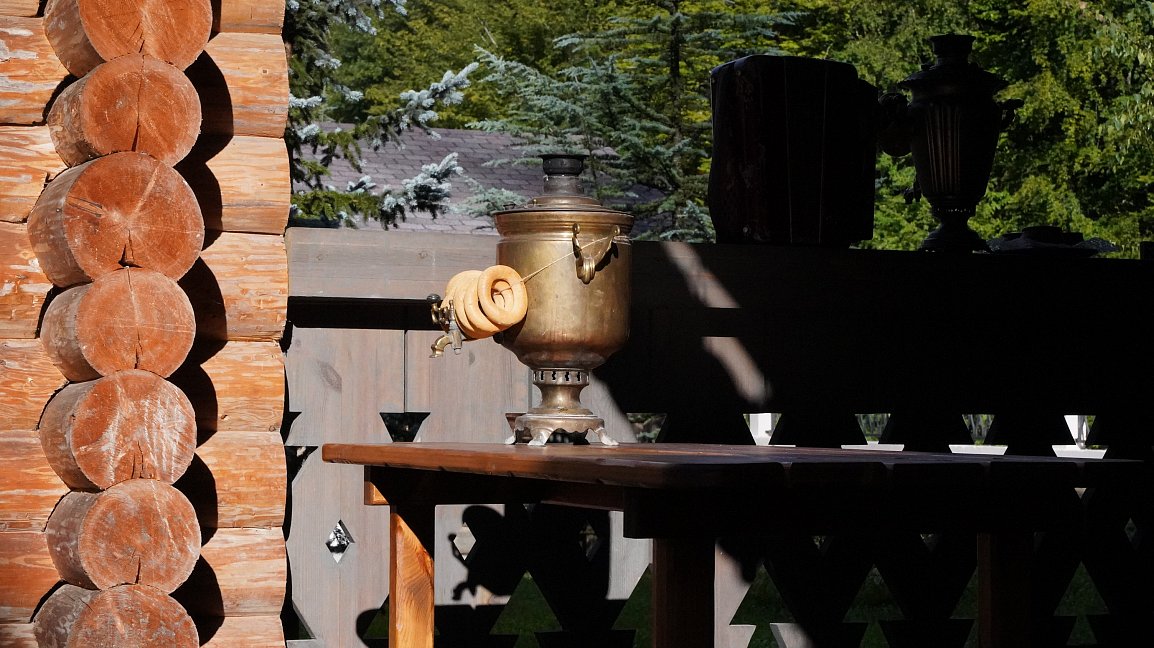 Переступая порог добротного сруба, словно попадаешь в палаты Ивана Грозного. Тяжелая мебель из массива, роспись русской вязью под потолками, авторские светильники из латуни и золотые рыбки, которые плещутся на ковре под ногами.