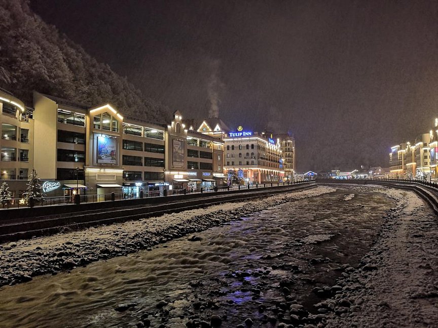 - расположен в самом сердце курорта «Роза Хутор», в 20 метрах от канатной дороги «Олимпия»
