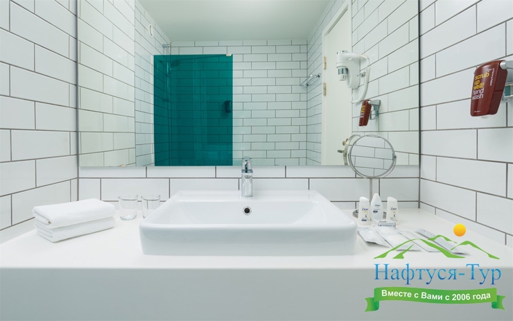 с ванной, тапочки, туалетные принадлежности, фен, халат