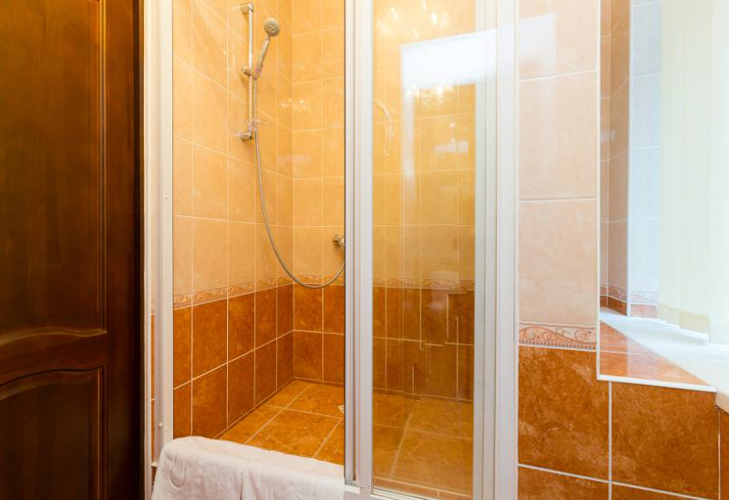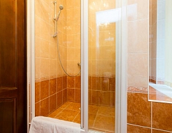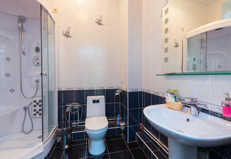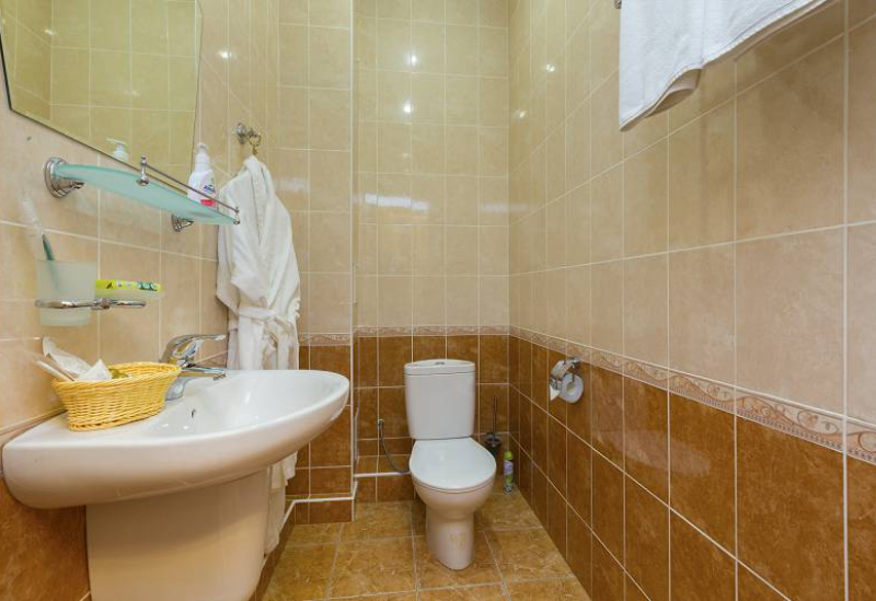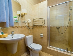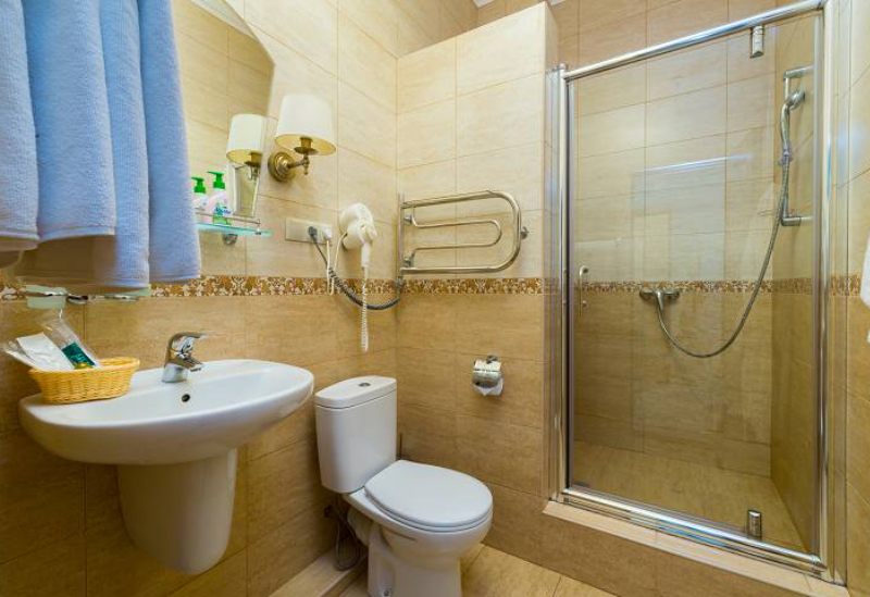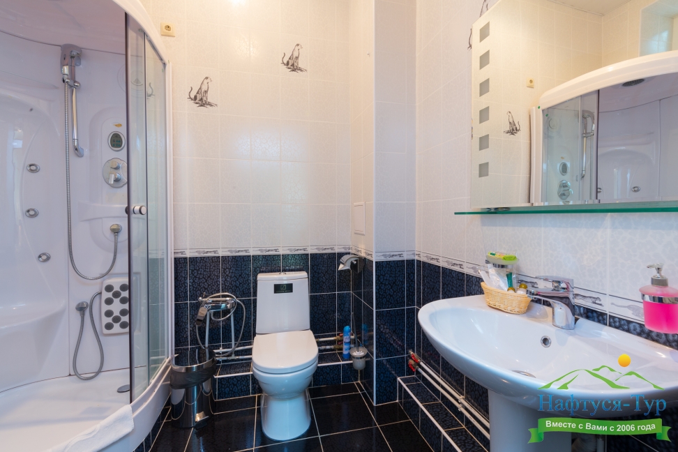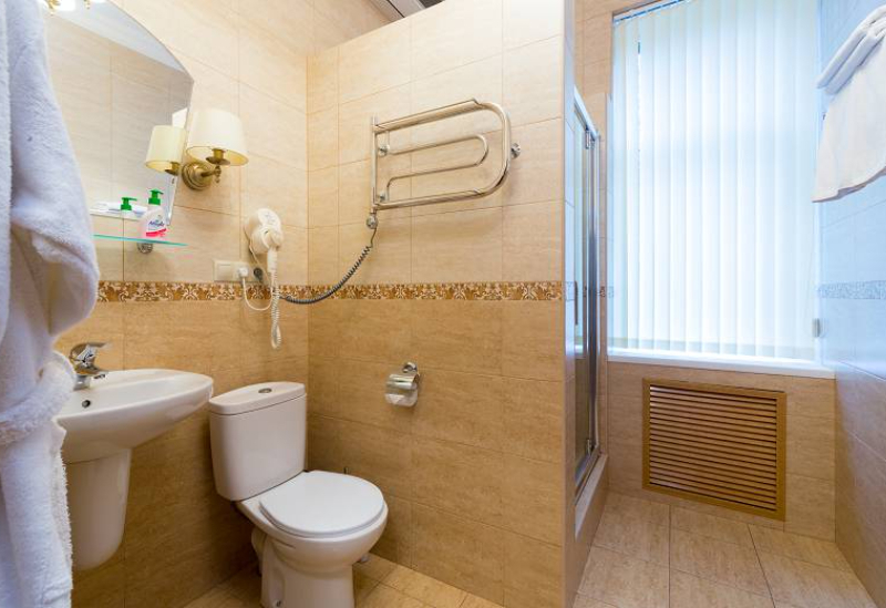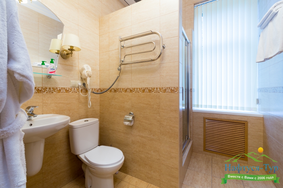 с душем, тапочки, туалетные принадлежности, фен, халат