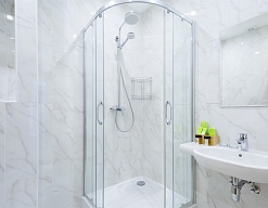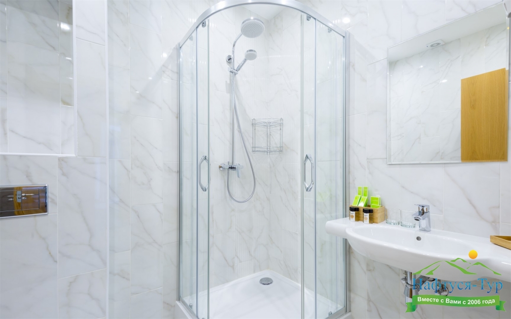 с душем, тапочки, туалетные принадлежности, фен, халат
