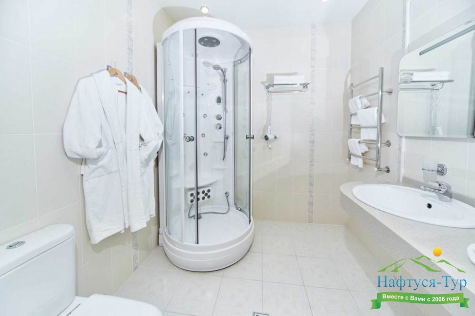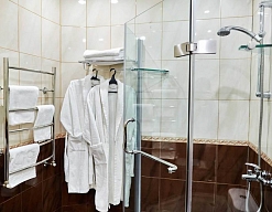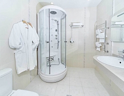 с душевой кабиной, тапочки, туалетные принадлежности, фен, халат