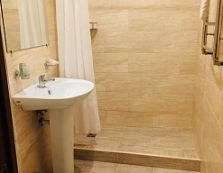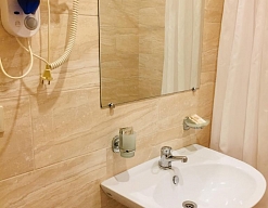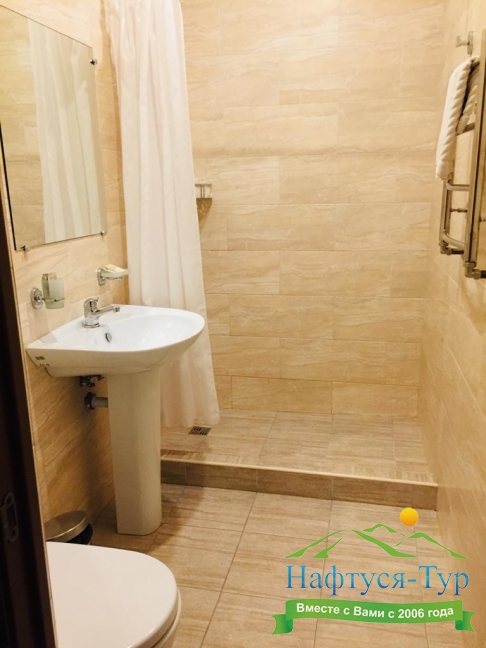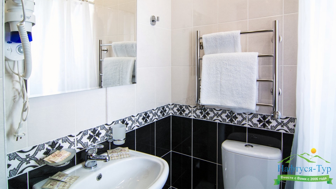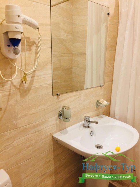 с душем, тапочки, туалетные принадлежности, фен, халат