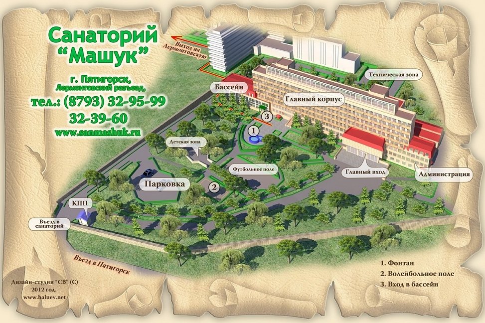 - от ж/д вокзала г. Пятигорск - 7 км: на маршрутном такси до санатория.