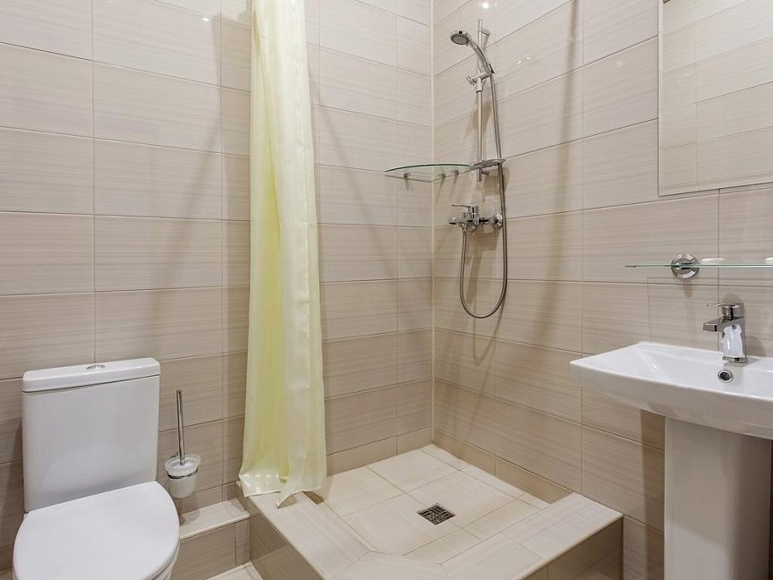 с душем, тапочки, туалетные принадлежности, фен, халат