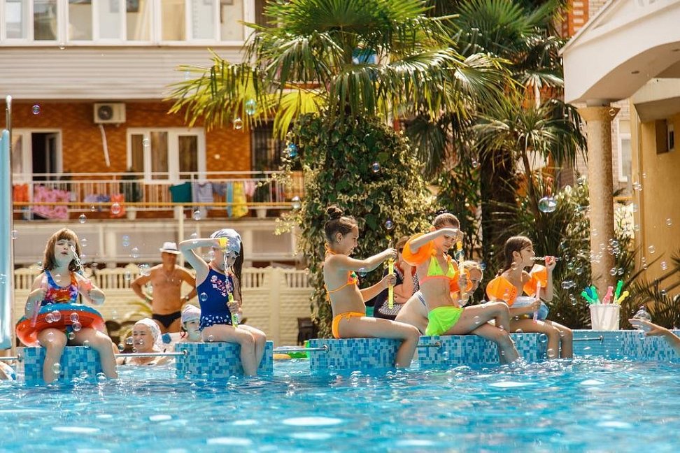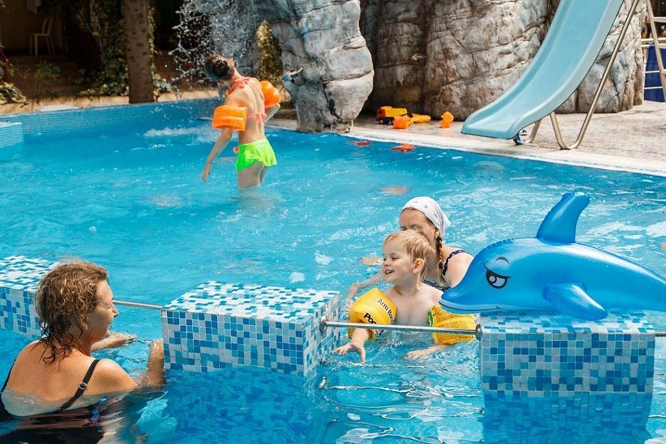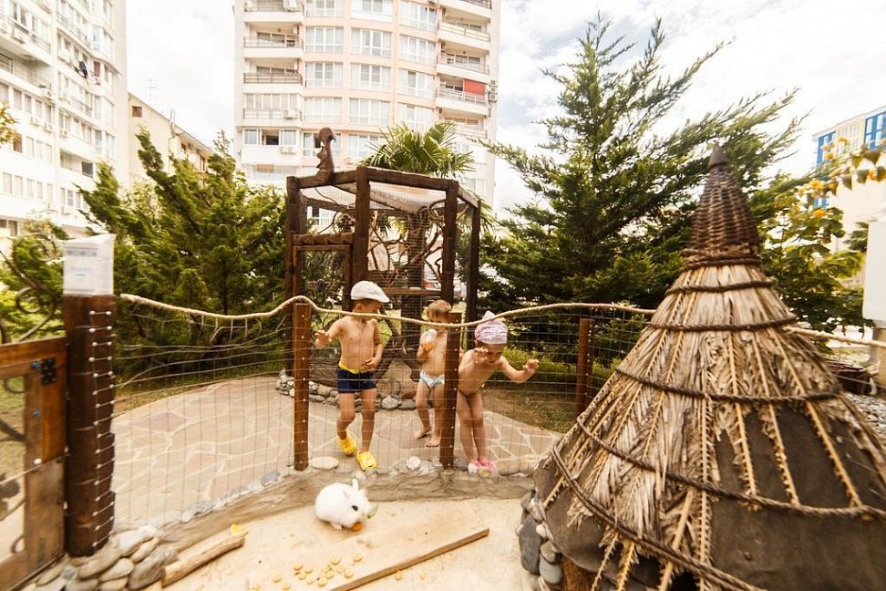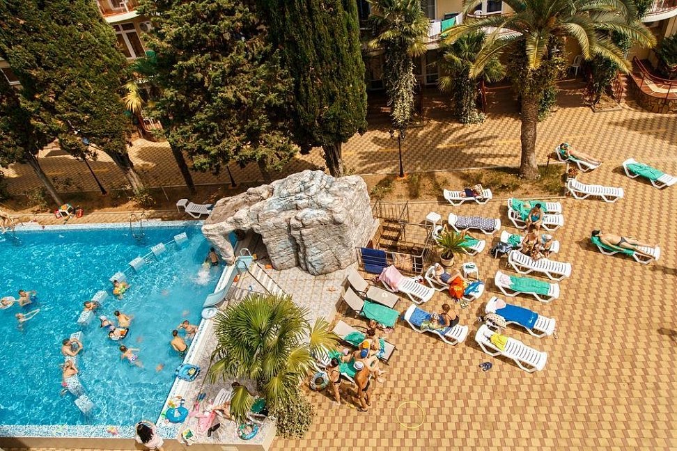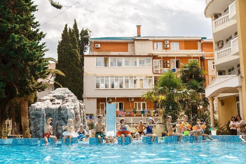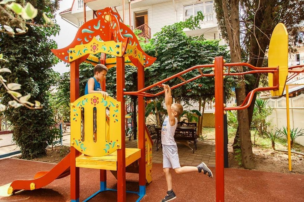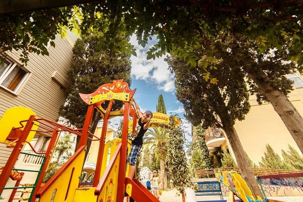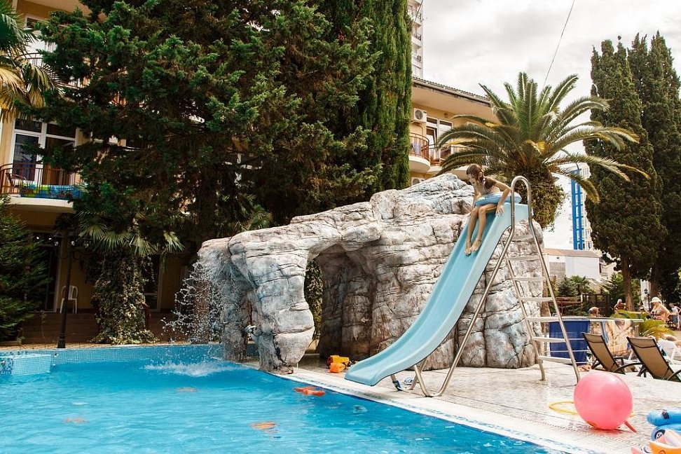 Отличный отель.Территория отеля очень красивая: бассейн для детей и взрослых, детская площадка, шашлычный дворик, кипарисы, пальмы, розы и др.