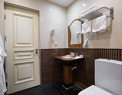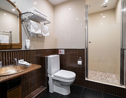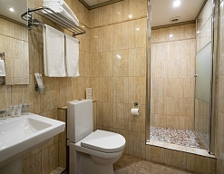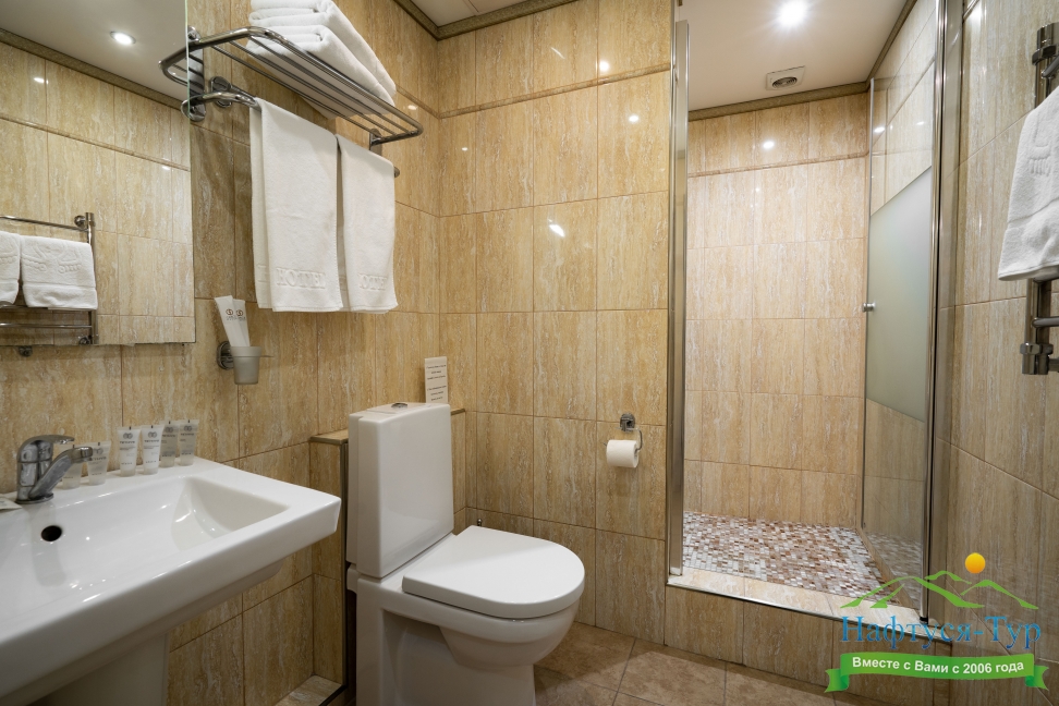 с душевой кабиной, тапочки, туалетные принадлежности, фен