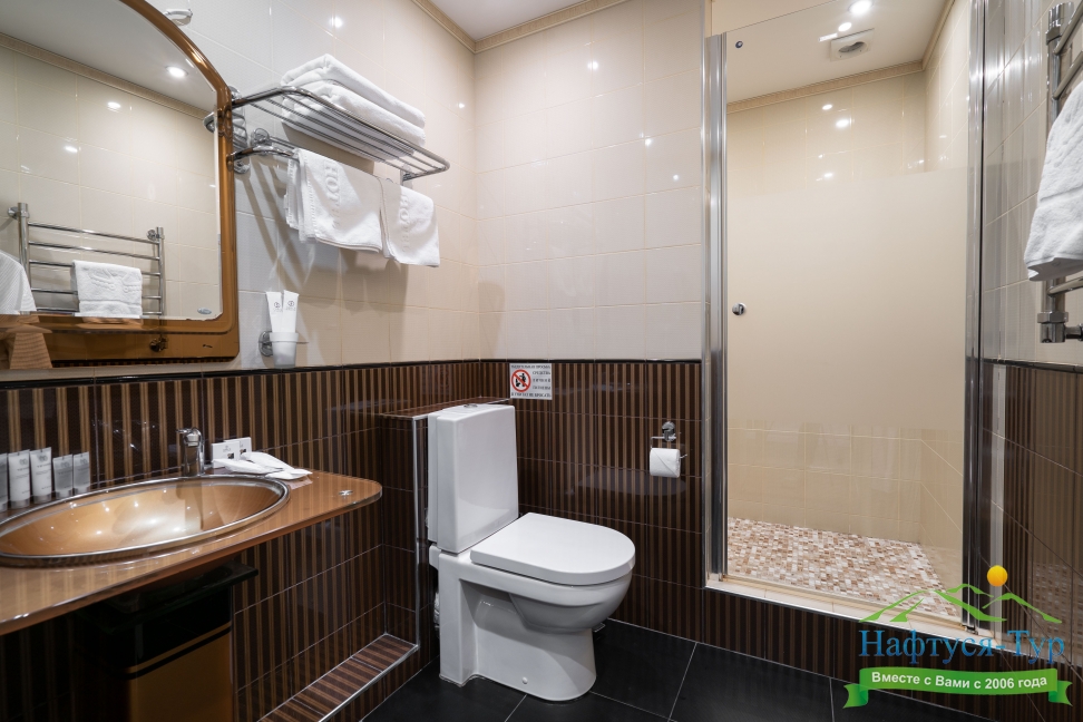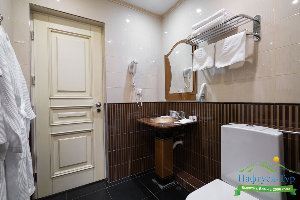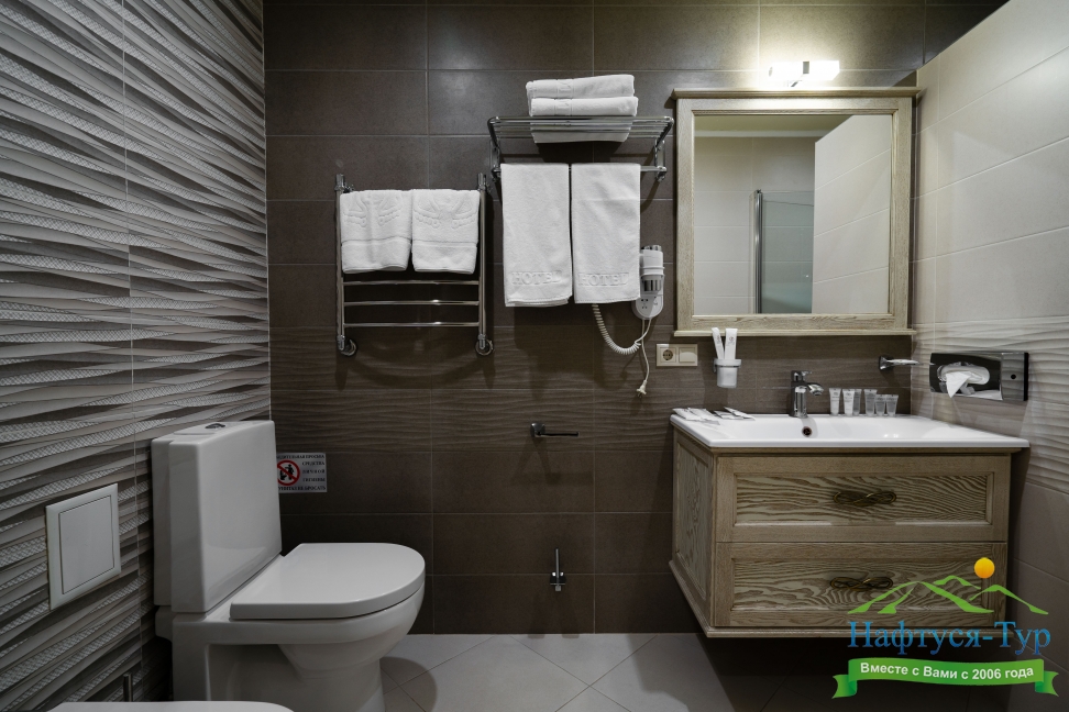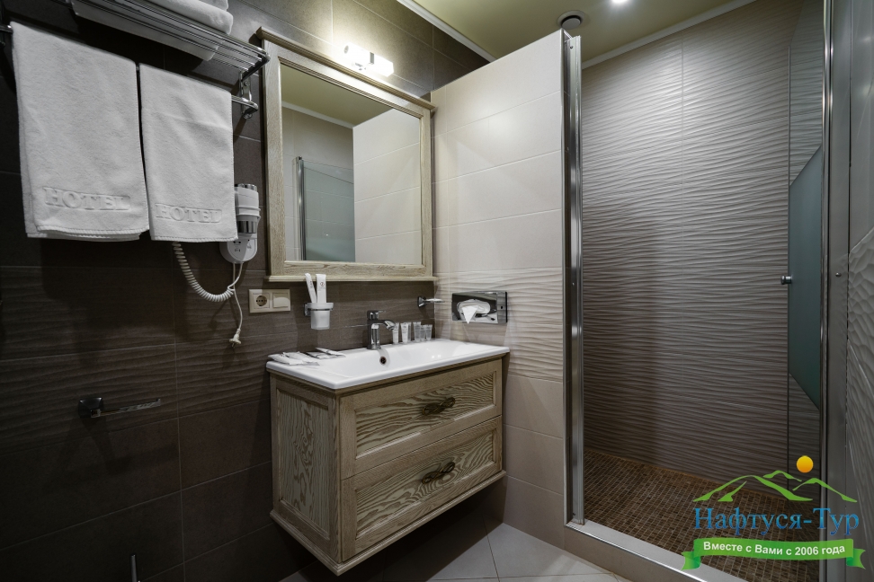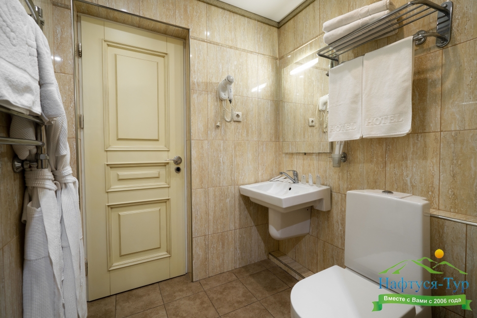 с душем, тапочки, туалетные принадлежности, фен