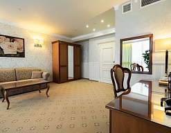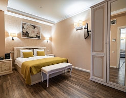 вешалка, диван, зеркало, кровать двуспальная, прикроватные тумбочки, стол, столик туалетный, стулья, шкаф