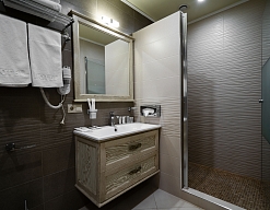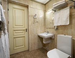 с душевой кабиной, тапочки, туалетные принадлежности, фен, халат