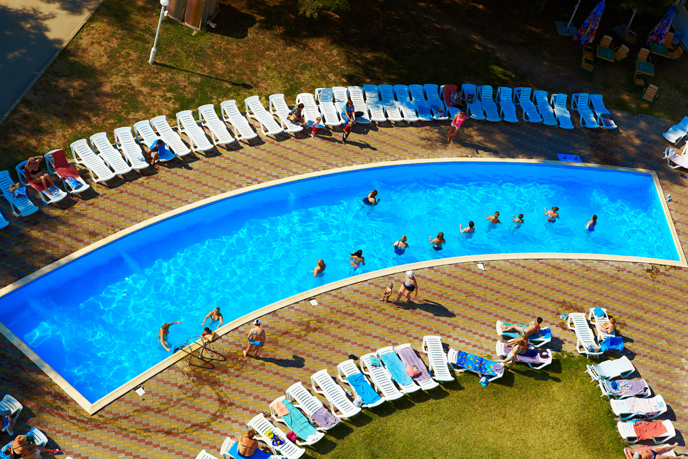 На огороженной территории расположились два открытых бассейна, как детский так и взрослый, русская баня, и ресторан.