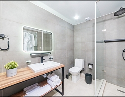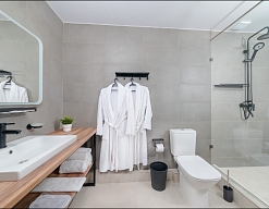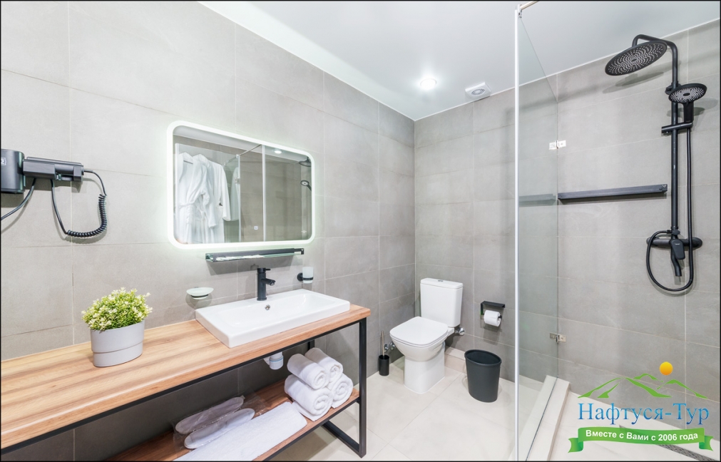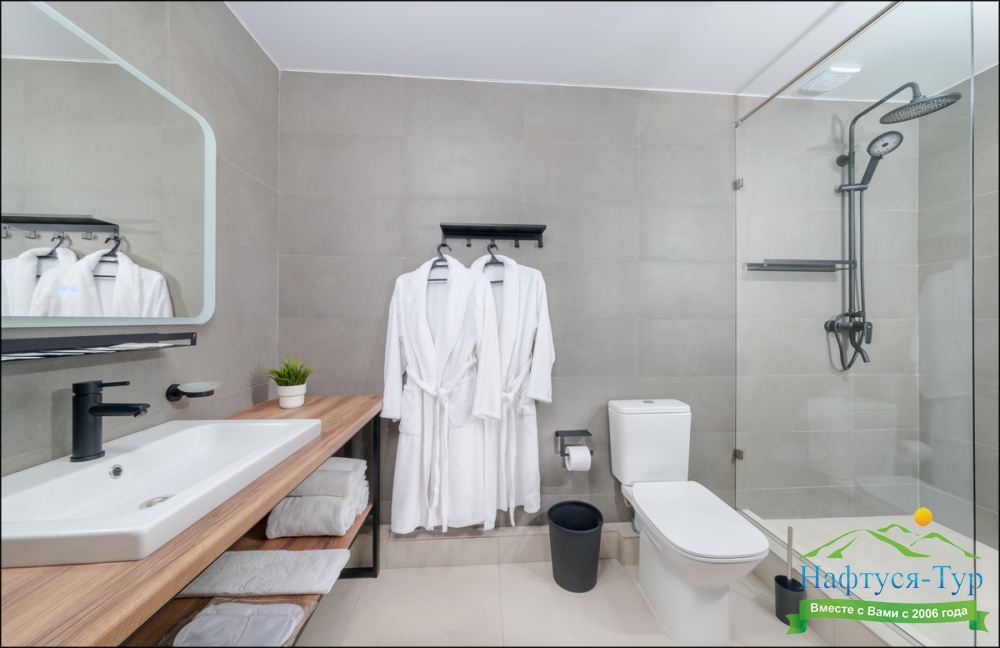 с душем (поддон), тапочки, туалетные принадлежности, фен, халат