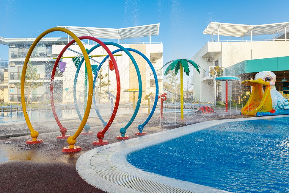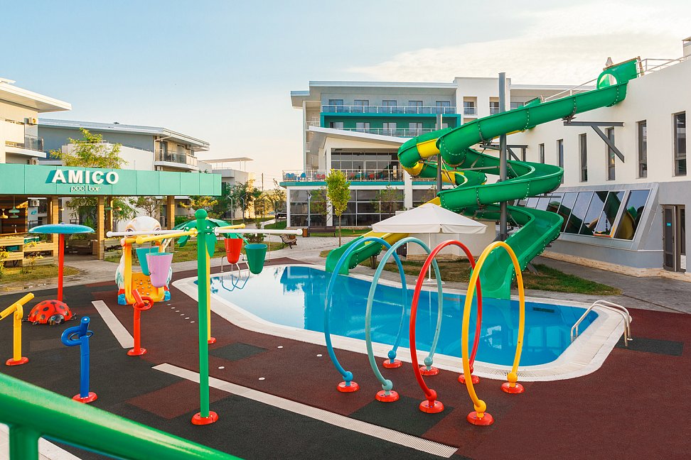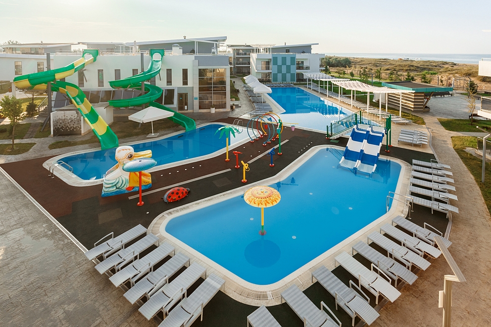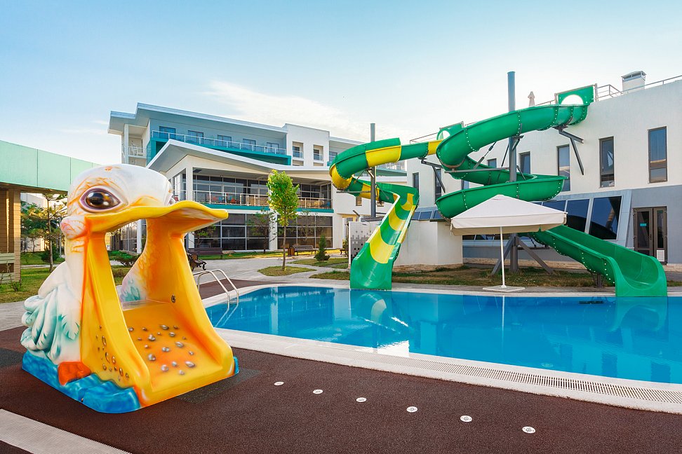 Малый детский подогреваемый бассейн размером 14*6 метров и глубиной 60 см, также включающий в себя три аквагорки;