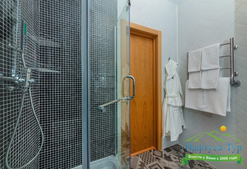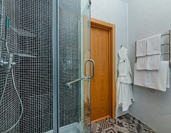 с душевой кабиной, тапочки, туалетные принадлежности, фен, халат