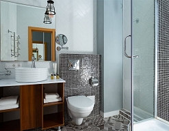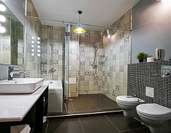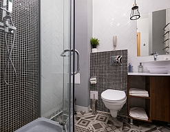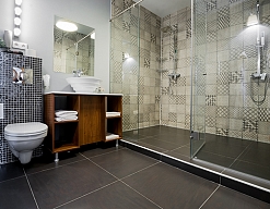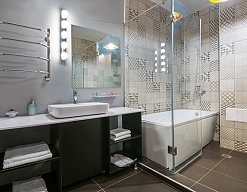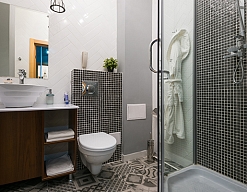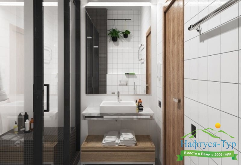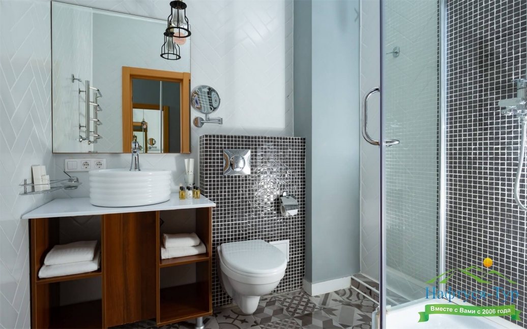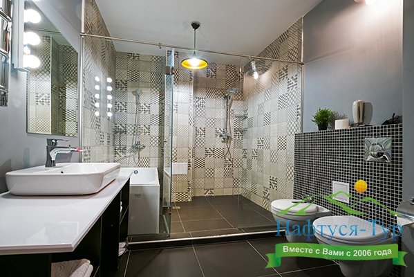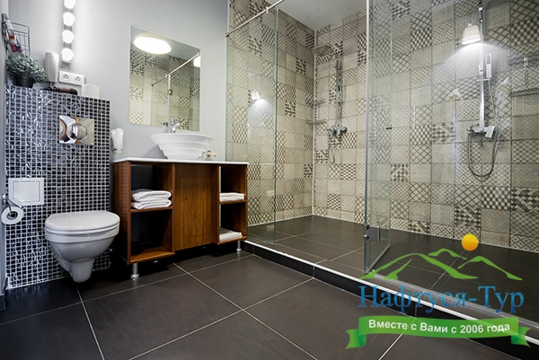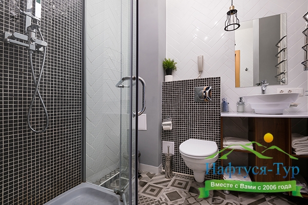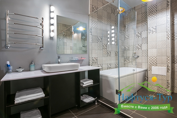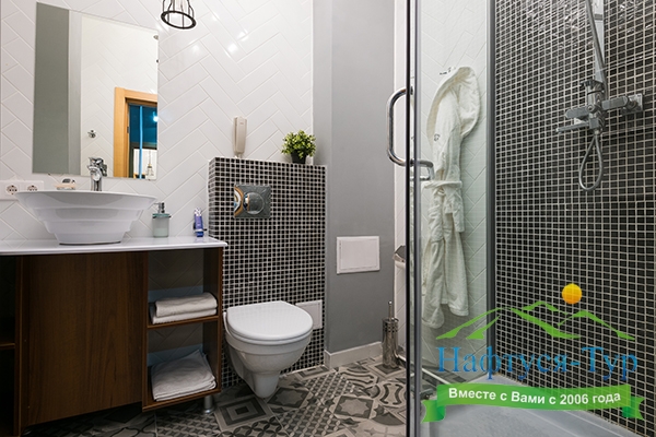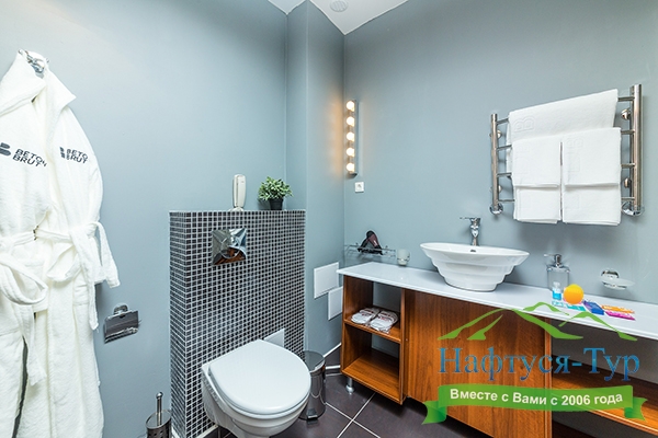 с ванной, с душем, тапочки, туалетные принадлежности, фен, халат