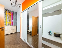 вешалка, зеркало, кровати односпальные /одна двуспальная кровать, прикроватные тумбочки, стол, стулья, шкаф
