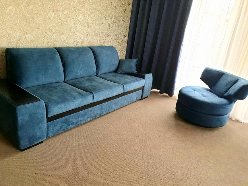 вешалка, диван, кресла, кровать двуспальная, прикроватные тумбочки, стол, шкаф