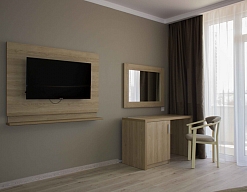 вешалка, зеркало, кровать двуспальная, прикроватные тумбочки, стол, стулья, шкаф