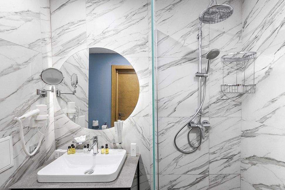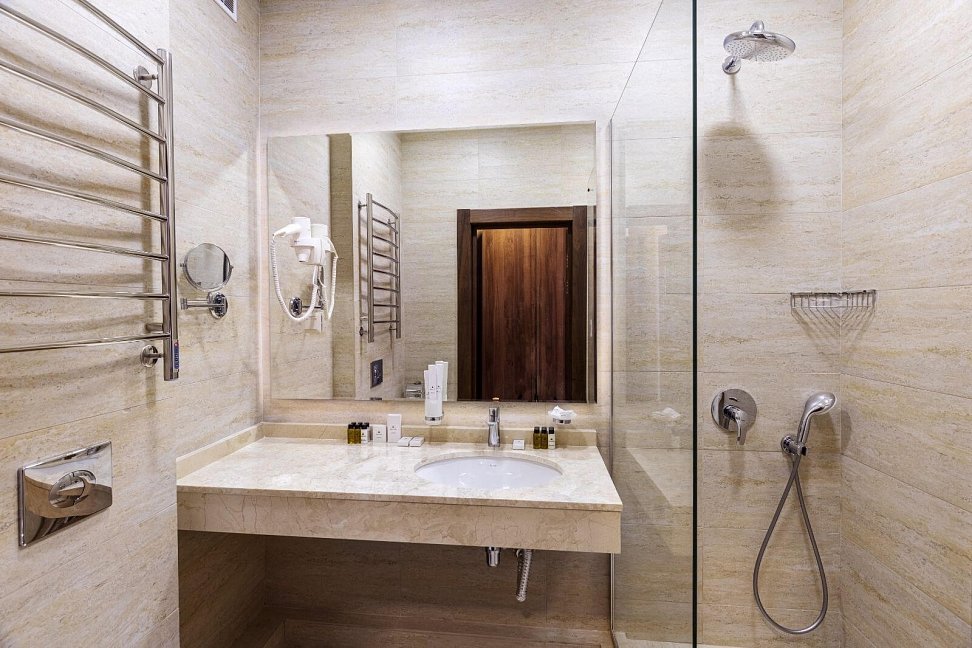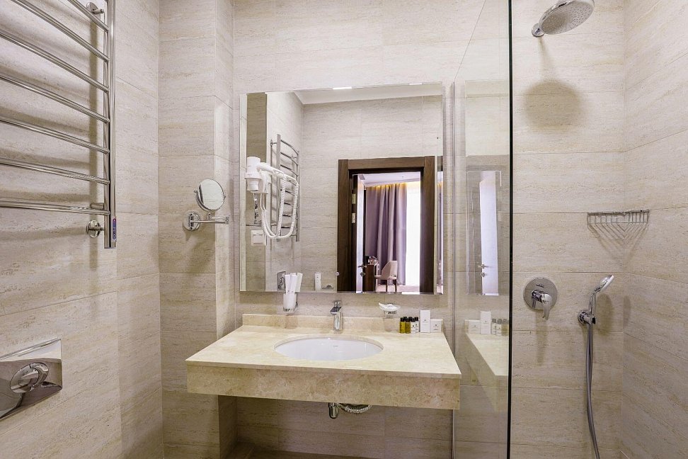 с душем, тапочки, туалетные принадлежности, фен, халат