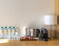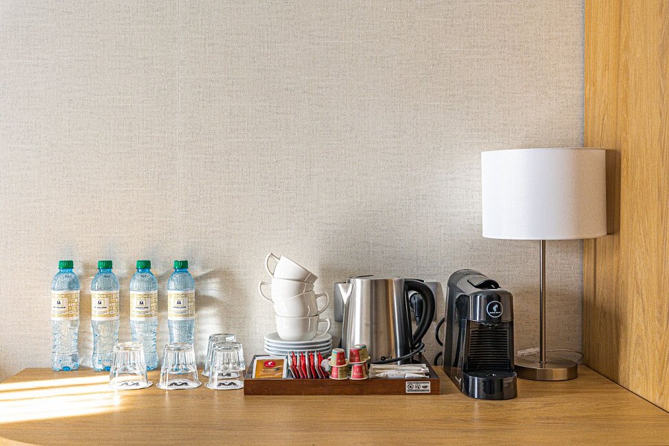 гладильная доска, кофемашина, мини-холодильник, сейф, сплит-система, телевизор ЖК, телефон, чайный набор посуды, электрочайник