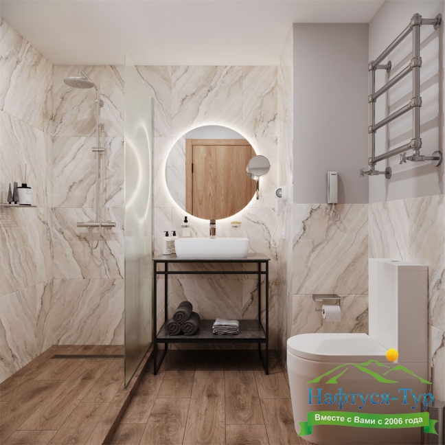 2 санузла, с душевой кабиной, тапочки, туалетные принадлежности, фен, халат