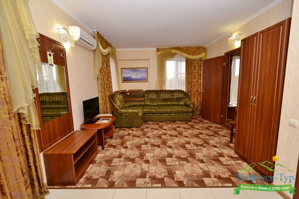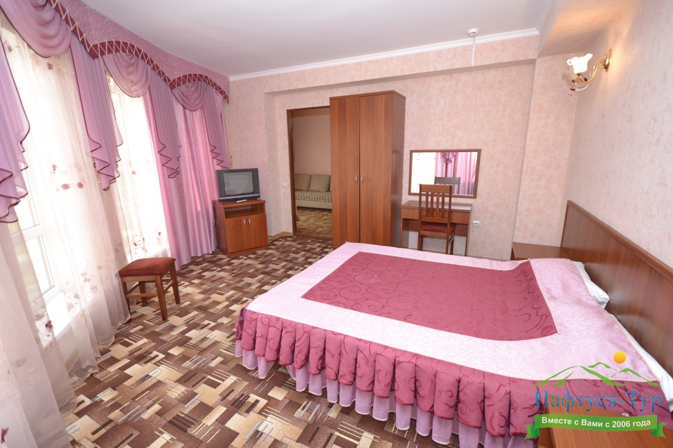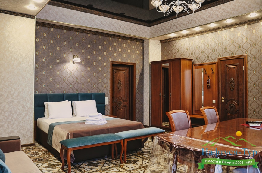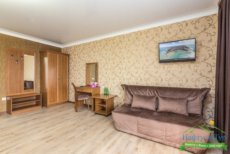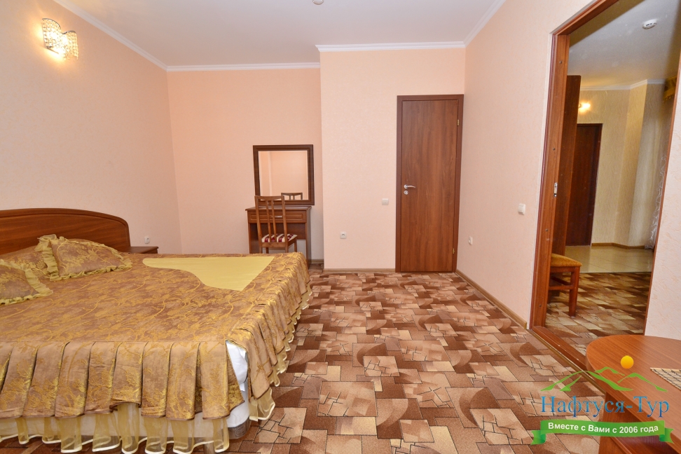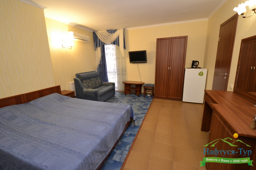 кресло-кровать, кровать двуспальная, прикроватные тумбочки, стол, стулья, шкаф