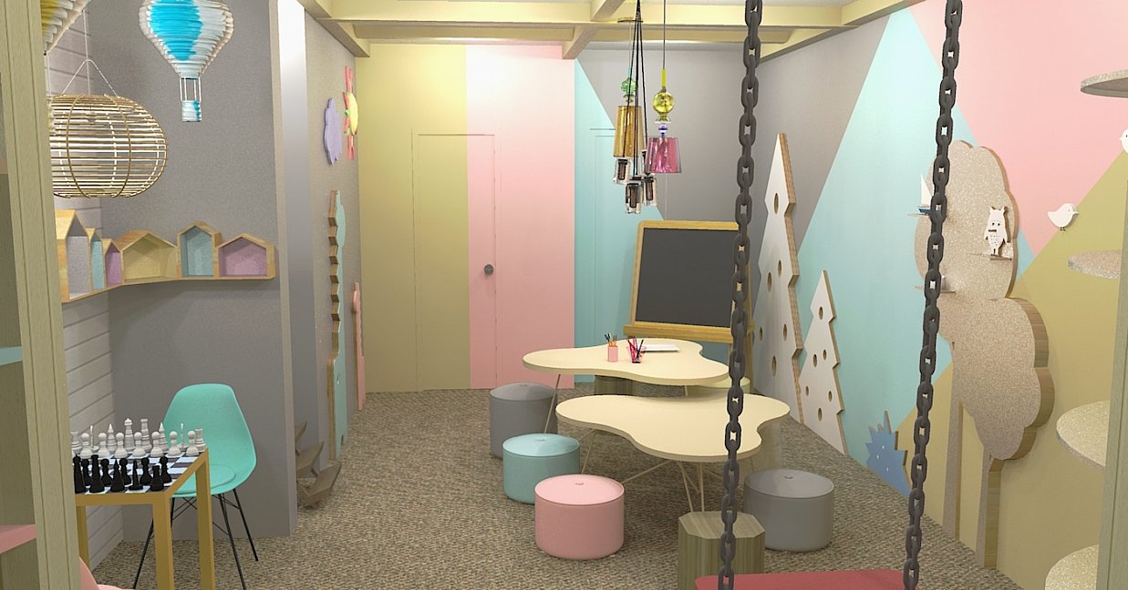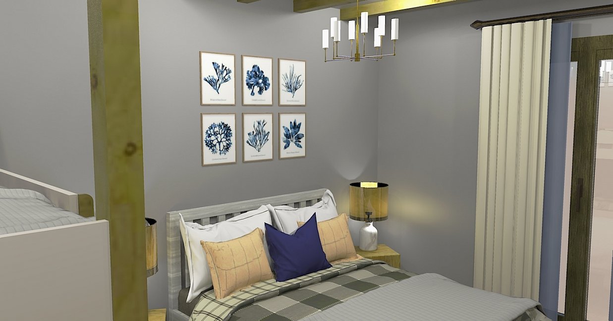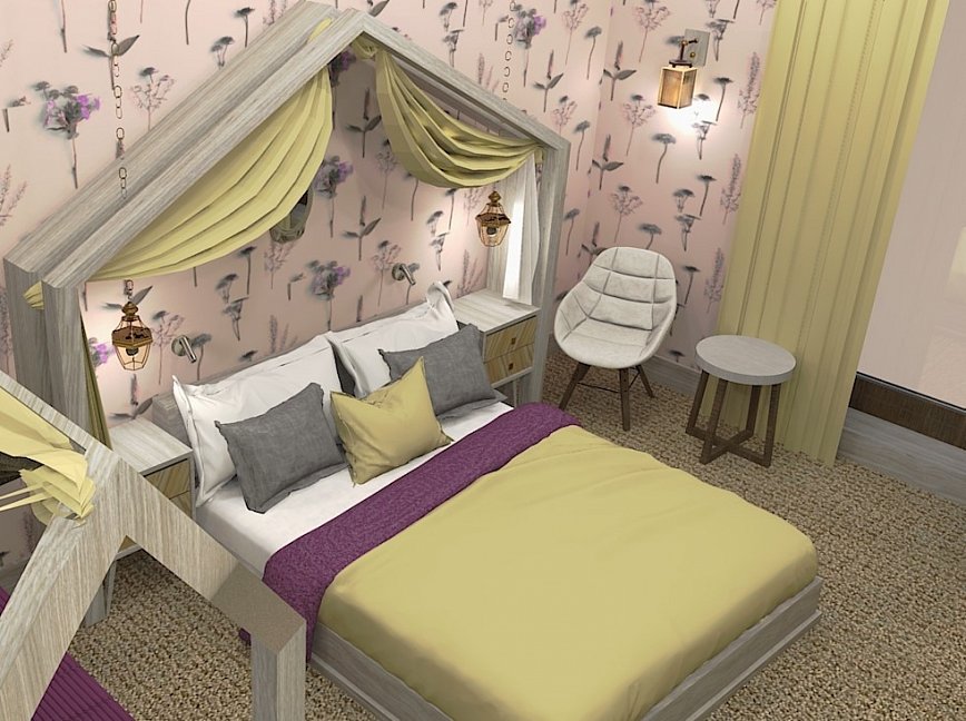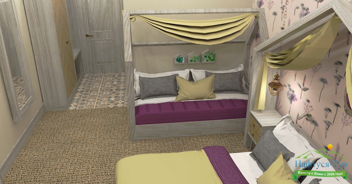вешалка, зеркало, кресло-кровать, кровать двуспальная, кровать двухъярусная, прикроватные тумбочки, стол, стулья, шкаф