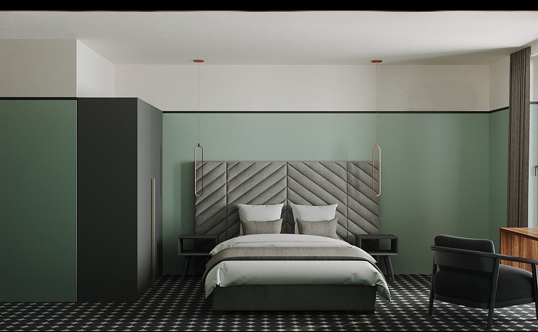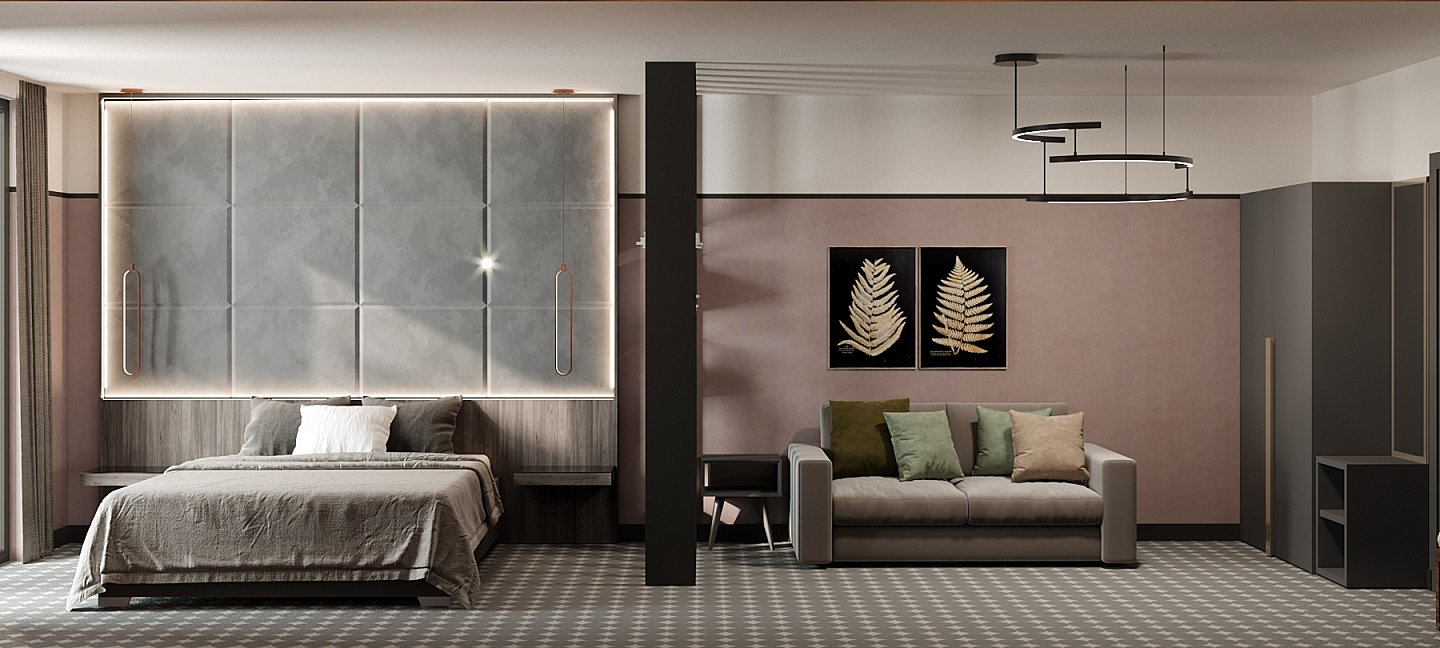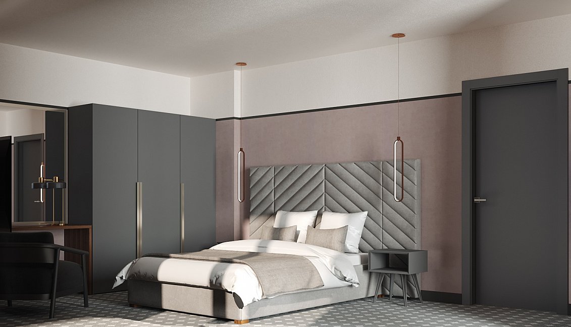 вешалка, диван, зеркало, кровать двуспальная, прикроватные тумбочки, стол, стулья, шкаф