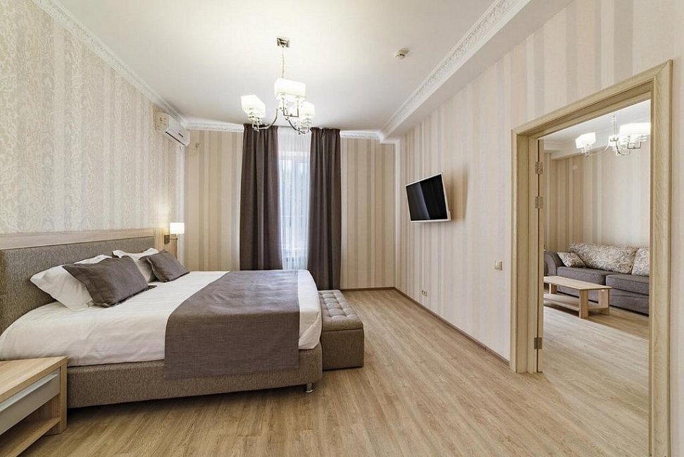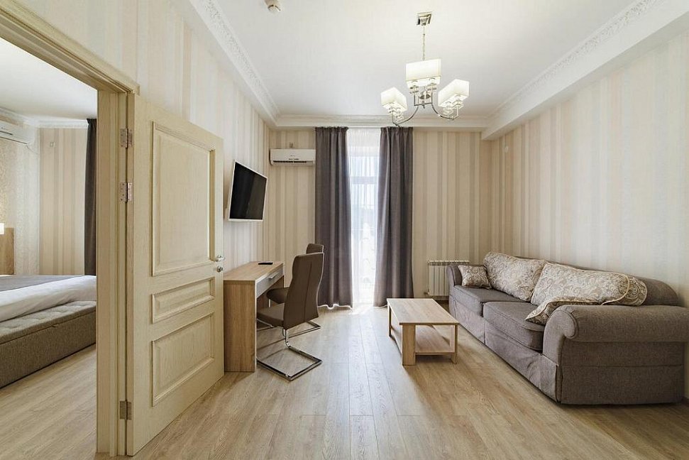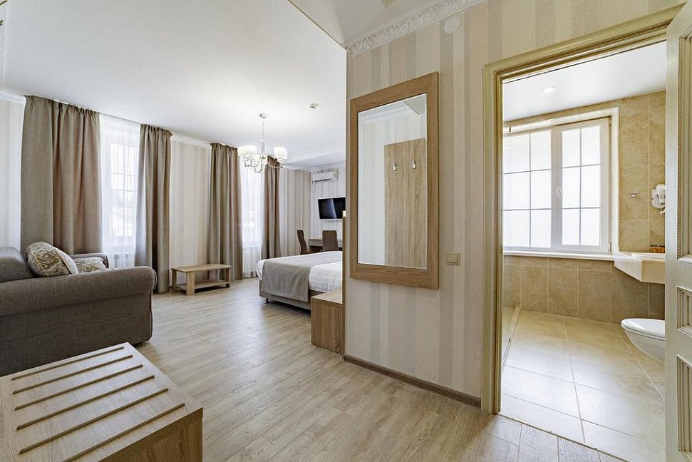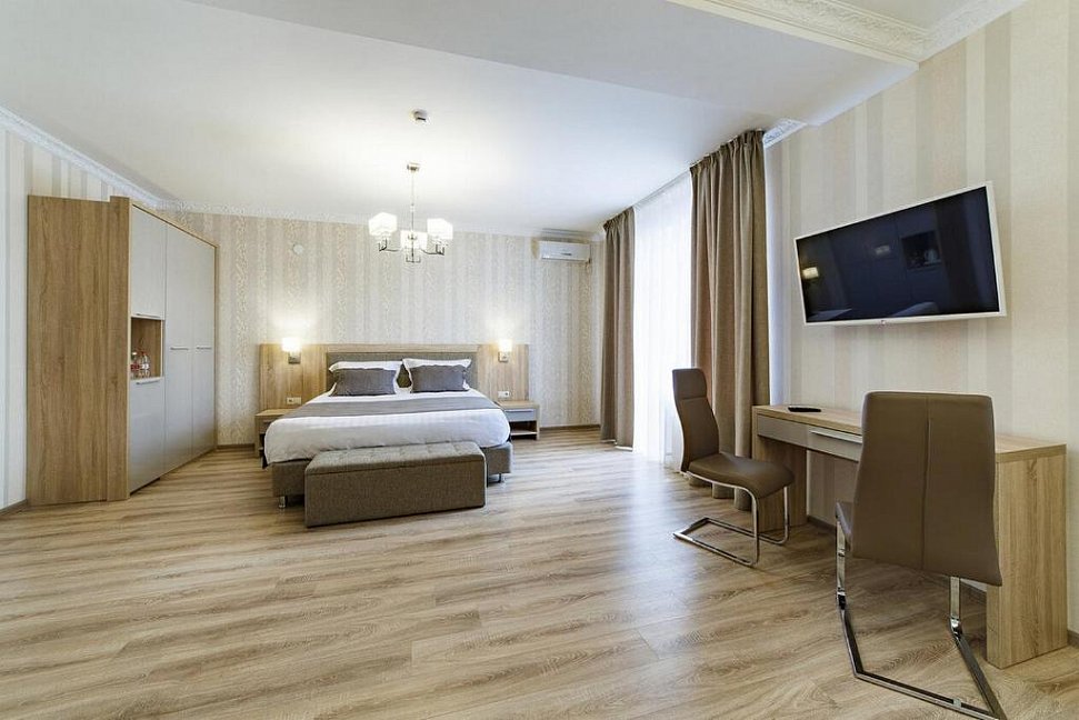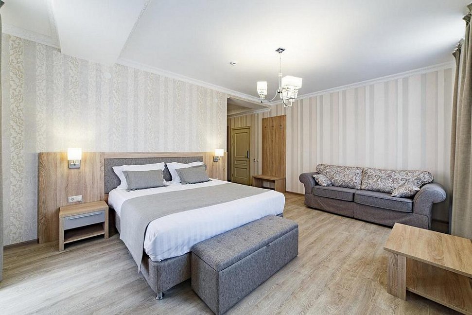 2-местный 2-комнатный люкс в коттедже (макс. 2+1 чел., телевизор, кондиционер, душ, фен, холодильник, туалетные принадлежности, балкон, сейф, телефон, 2-спальная кровать, мини-бар (платно)). Доп. место - диван, может быть установлен без ограничения по возрасту.