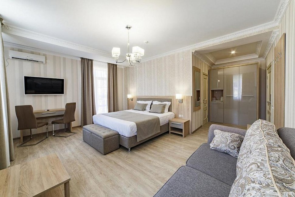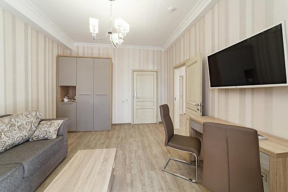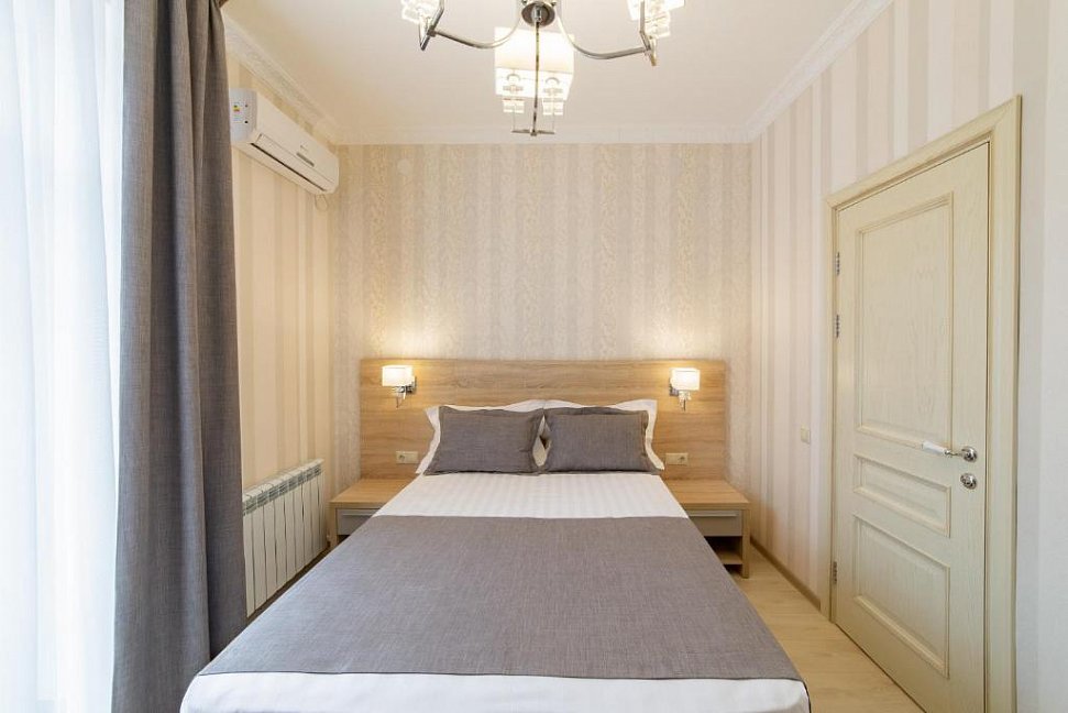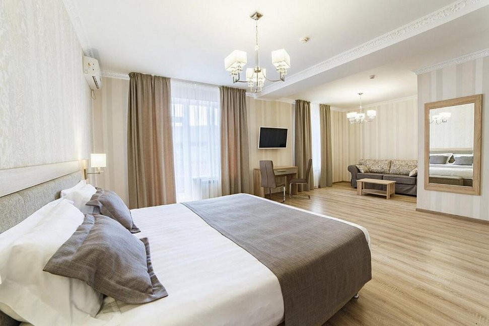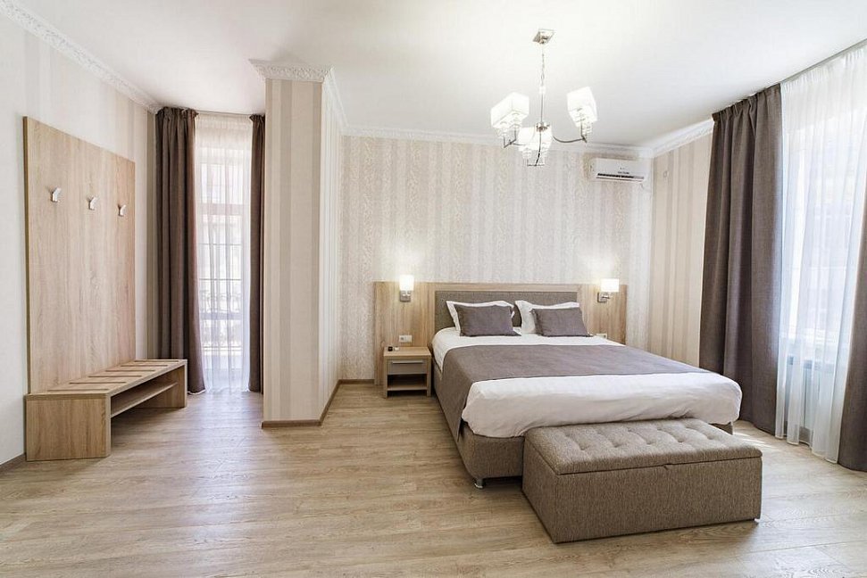 2-местный 2-комнатный люкс в коттедже (макс. 2+1 чел., телевизор, кондиционер, душ, фен, холодильник, туалетные принадлежности, балкон, сейф, телефон, 2-спальная кровать, мини-бар (платно)). Доп. место - диван, может быть установлен без ограничения по возрасту.
