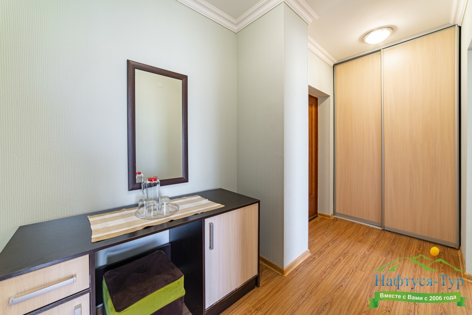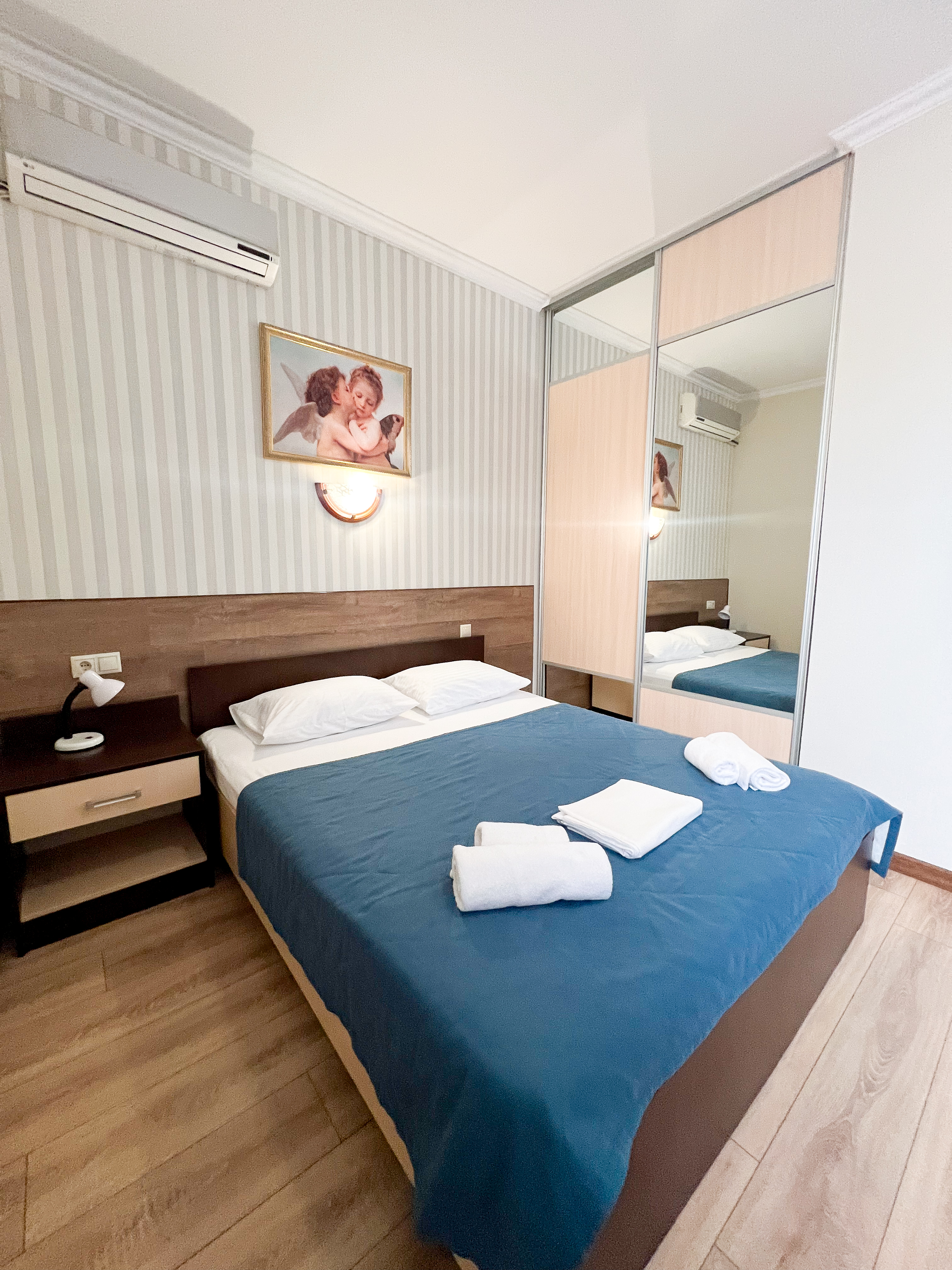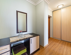 вешалка, зеркало, кровати односпальные /одна двуспальная кровать, прикроватные тумбочки, стол, стулья, шкаф