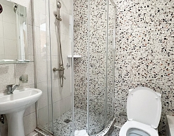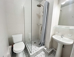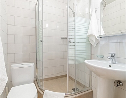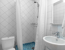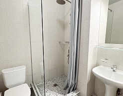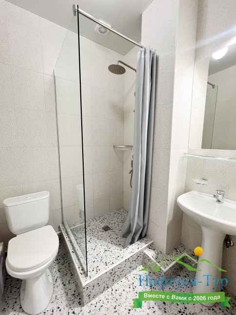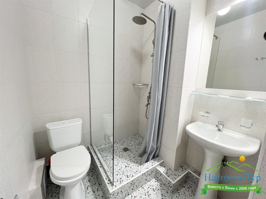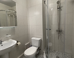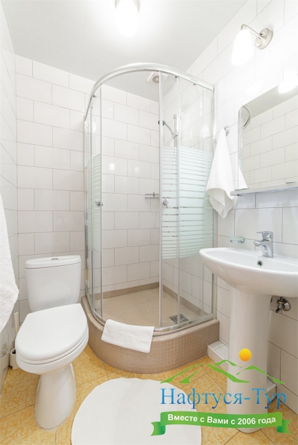 с душевой кабиной, туалетные принадлежности, фен