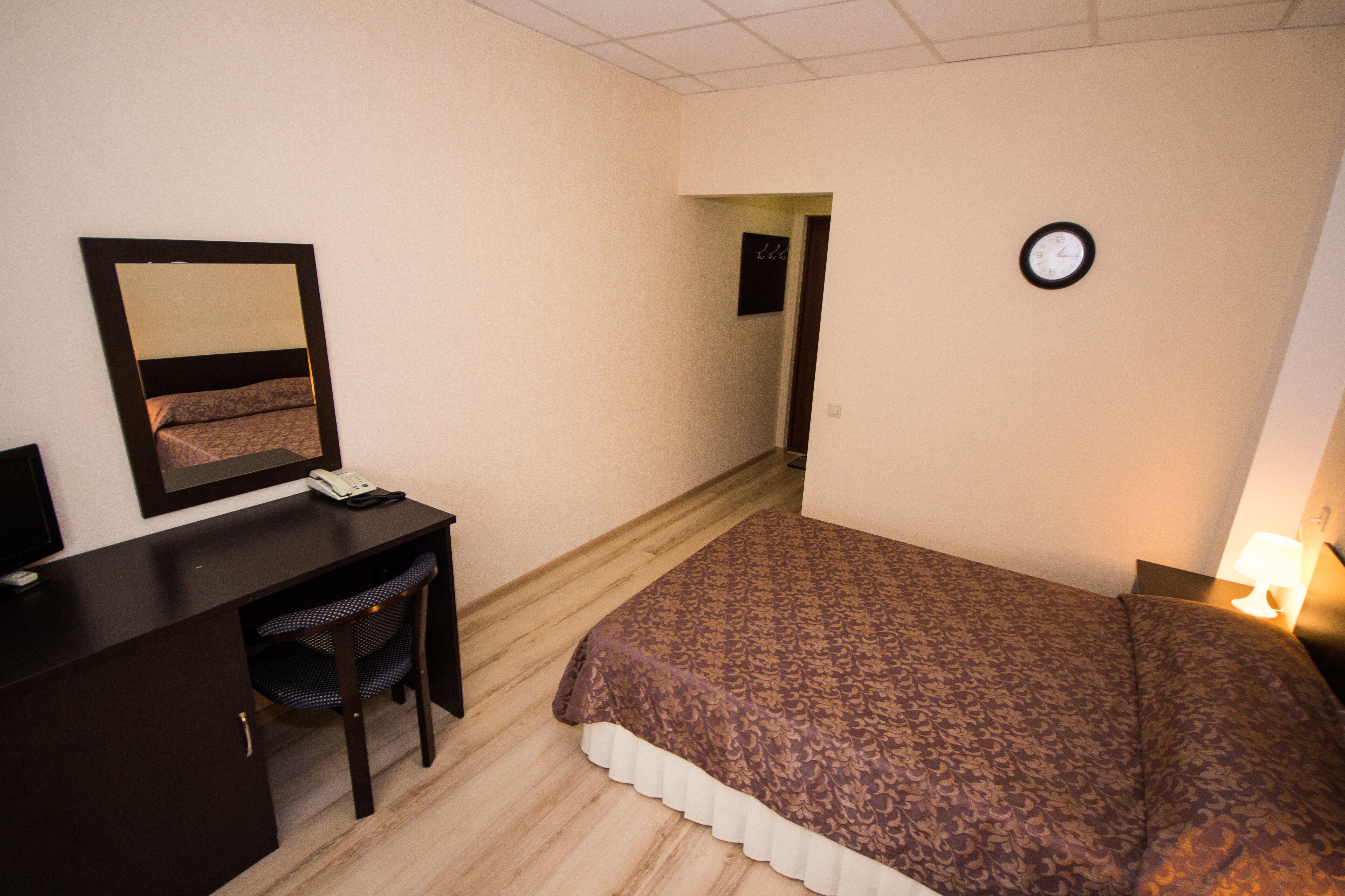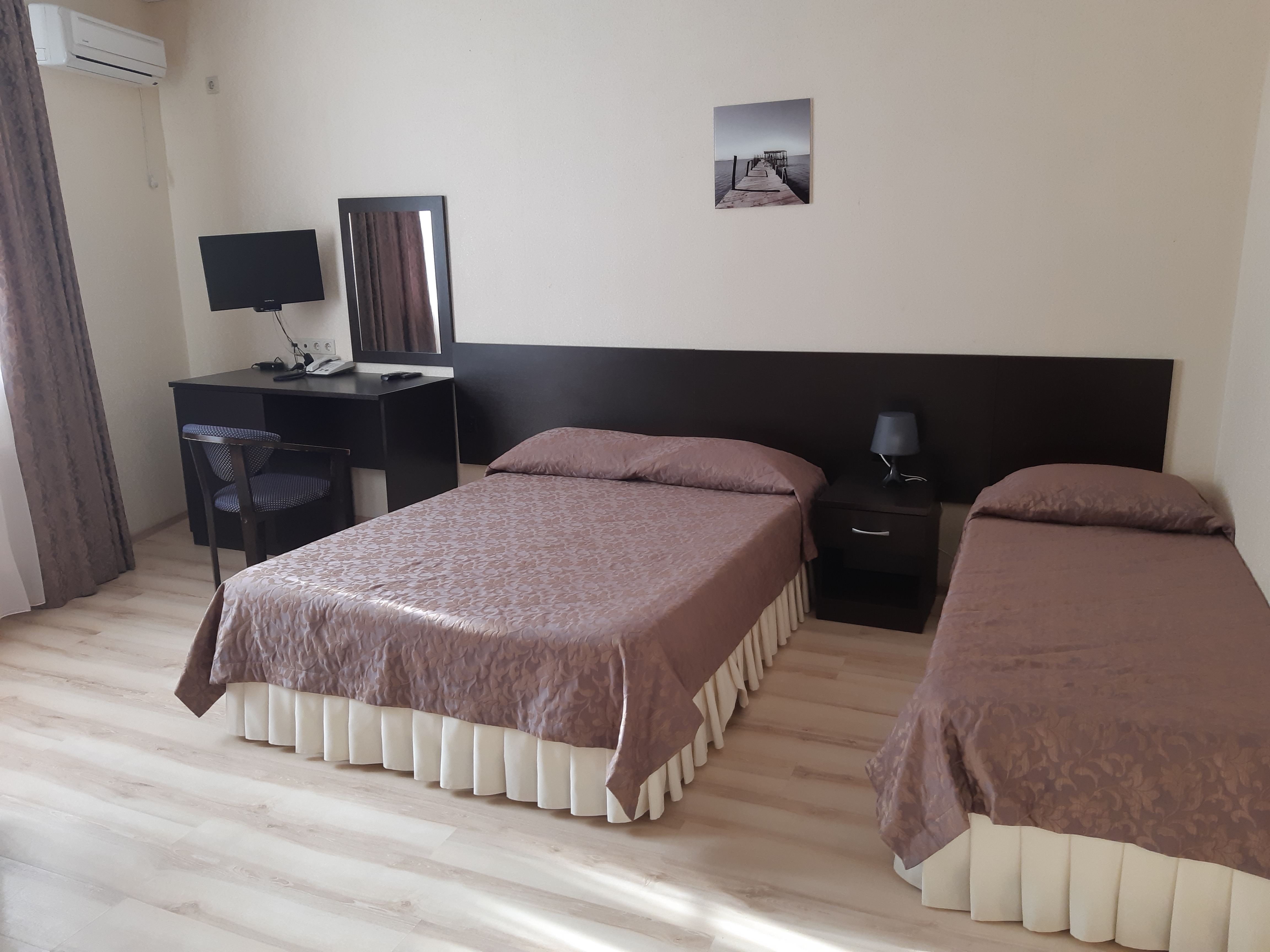 вешалка, зеркало, кровати односпальные /одна двуспальная кровать, прикроватные тумбочки, стол, стул, шкаф