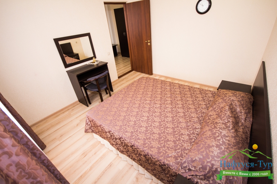 вешалка, диван раскладной, зеркало, кровать двуспальная, прикроватные тумбочки, стол, столик туалетный, стул, тумба багажная, шкаф