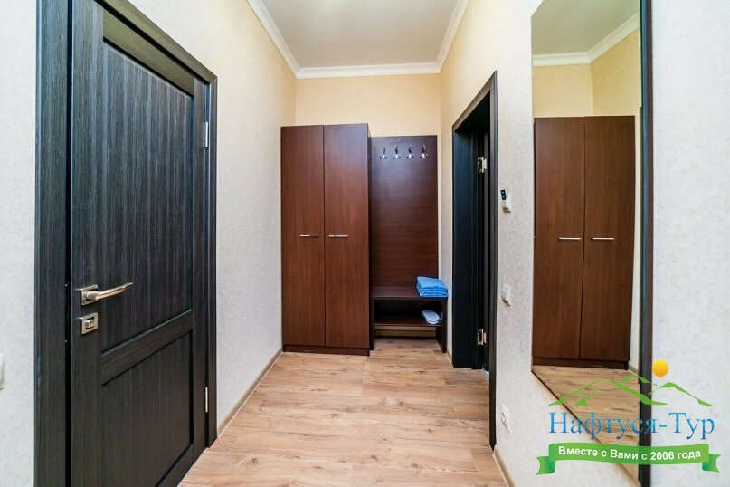 вешалка, зеркало, кресло-кровать, кровать двуспальная, прикроватная тумбочка, стол, стул