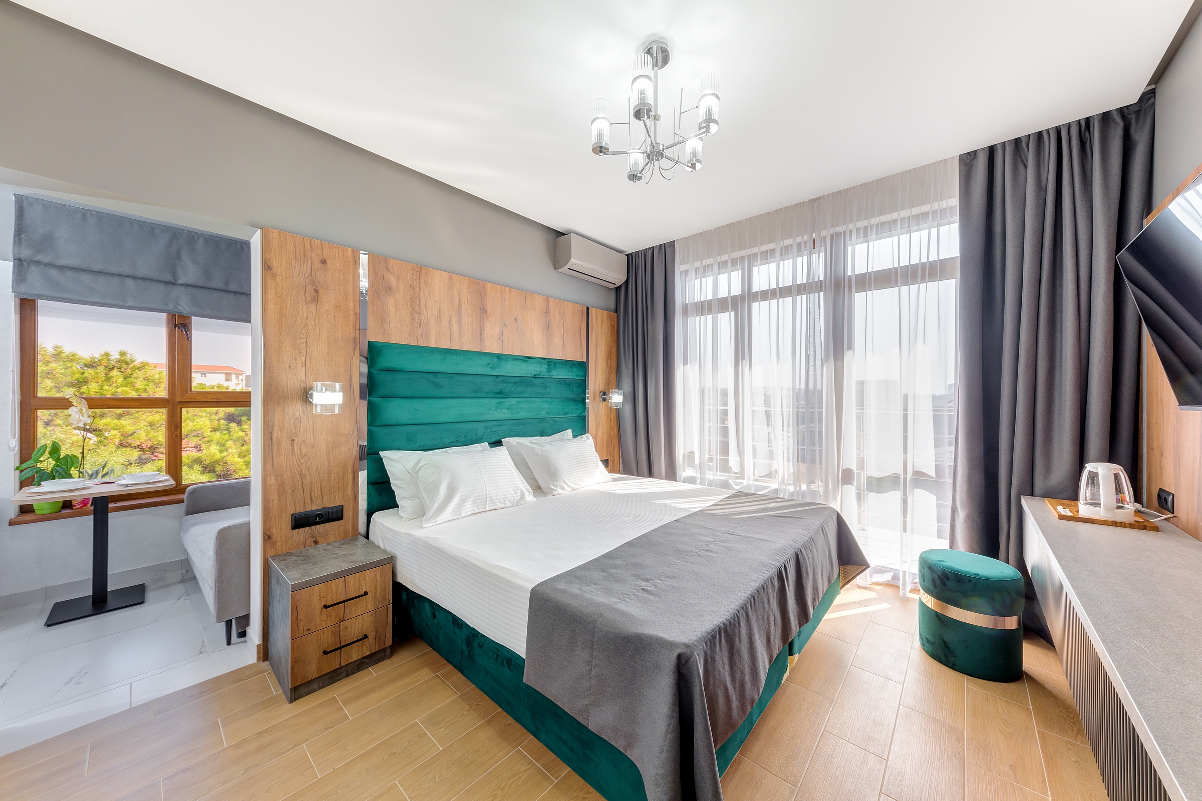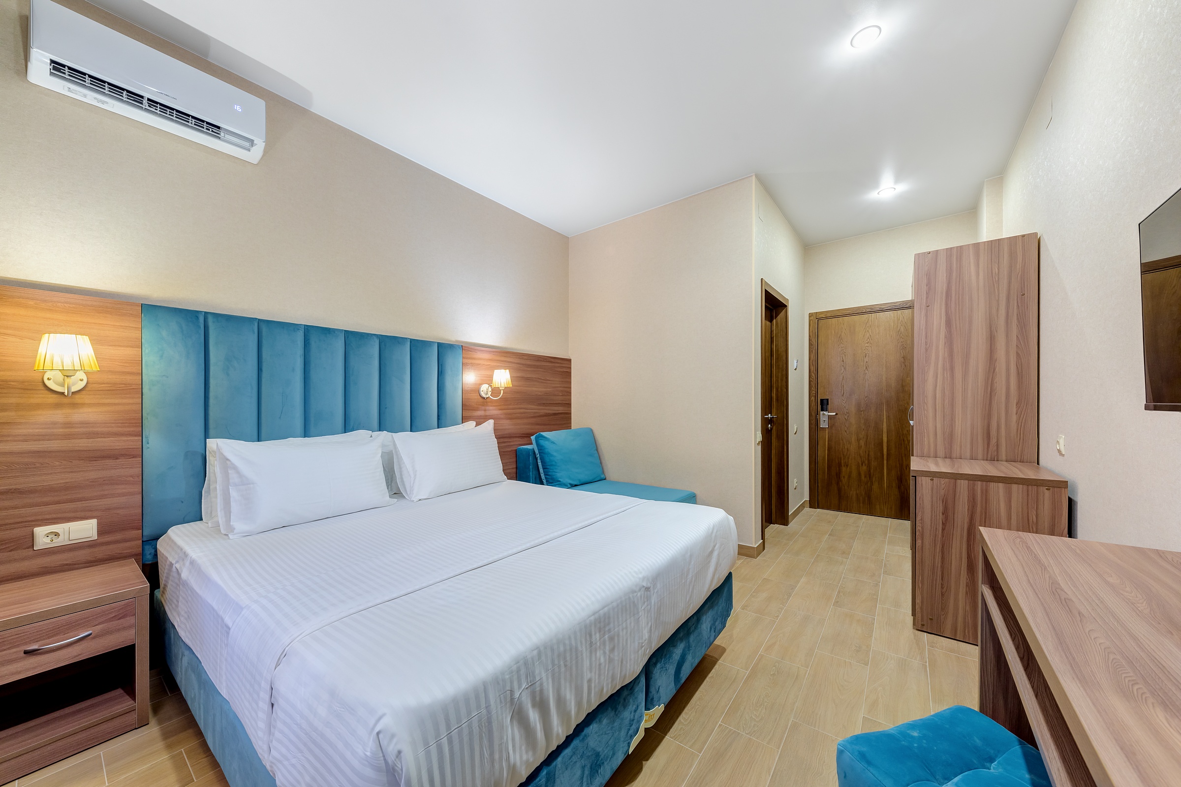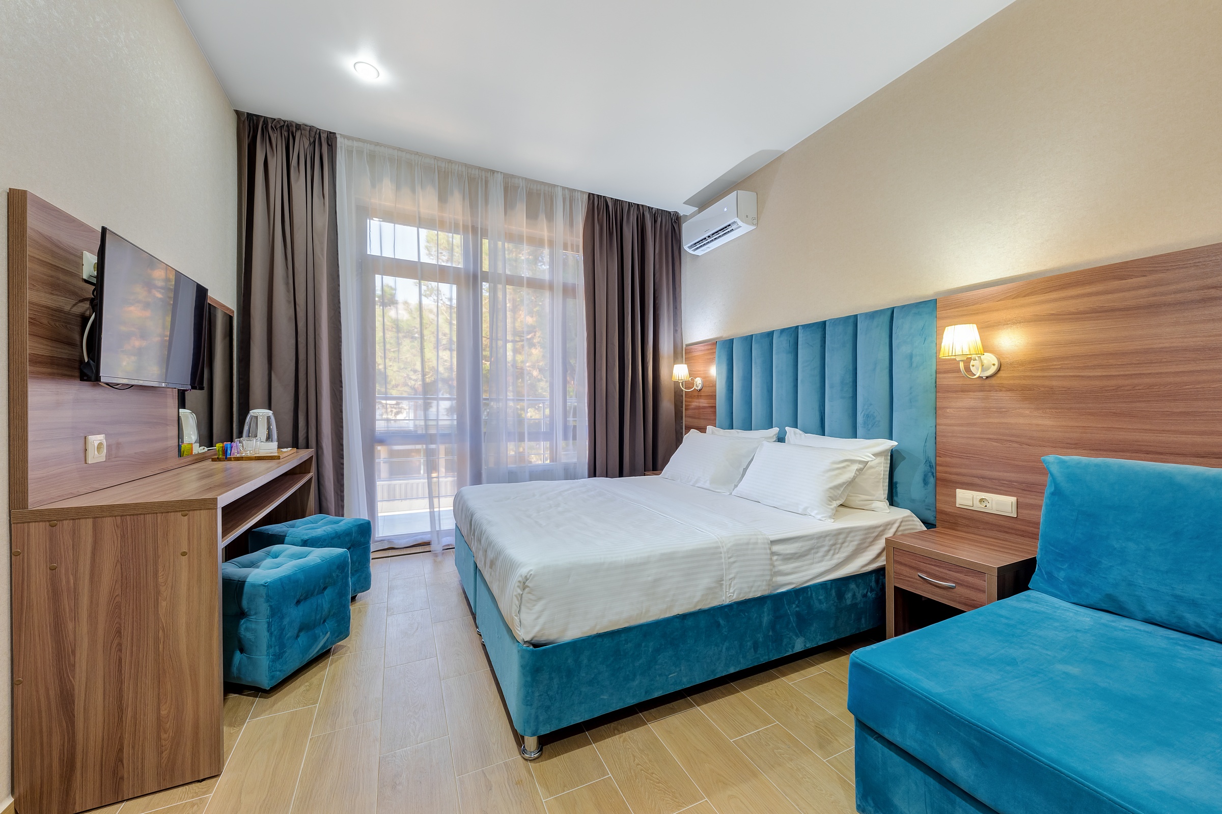 мини-холодильник, сейф, сплит-система, телевизор, телефон, чайная станция