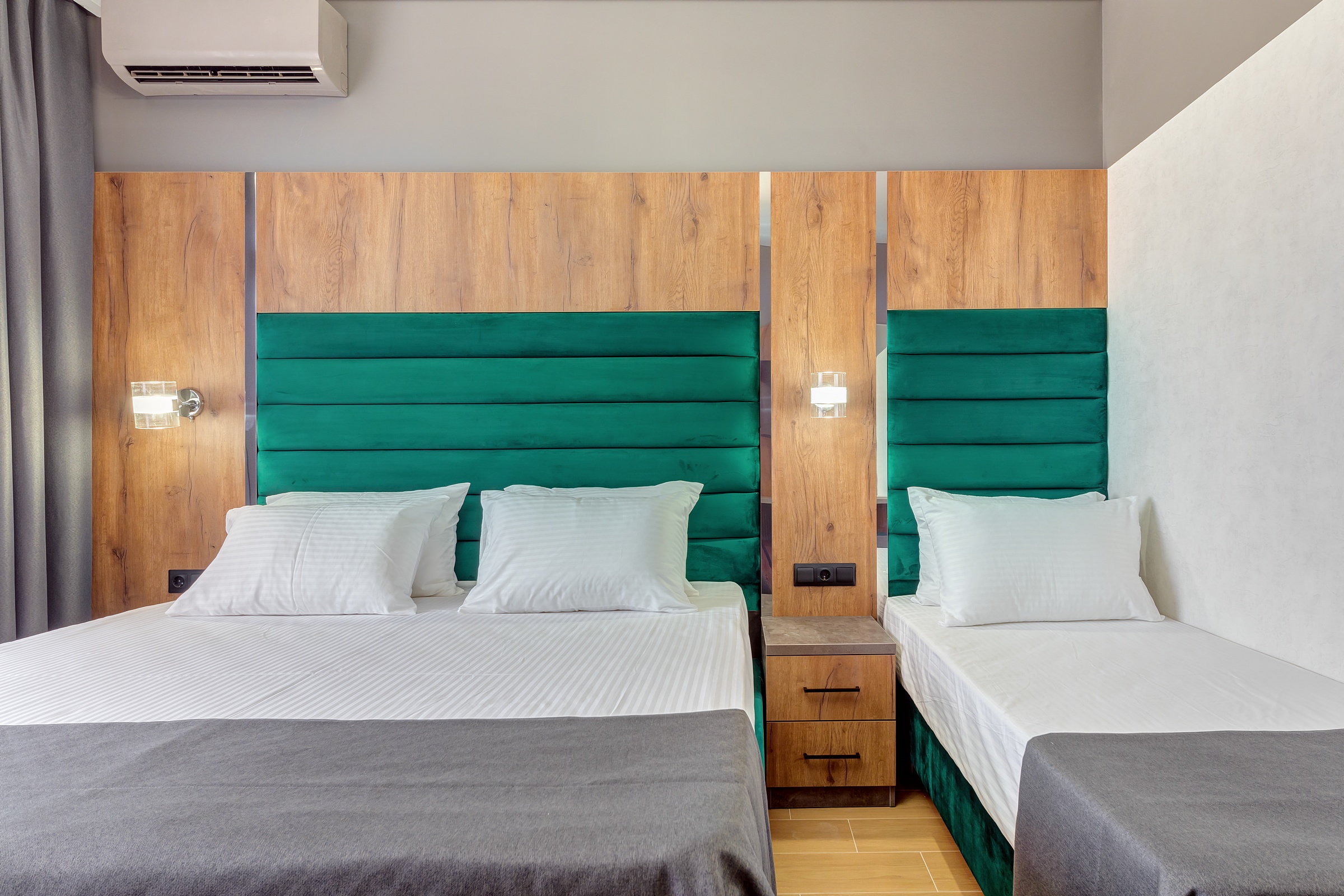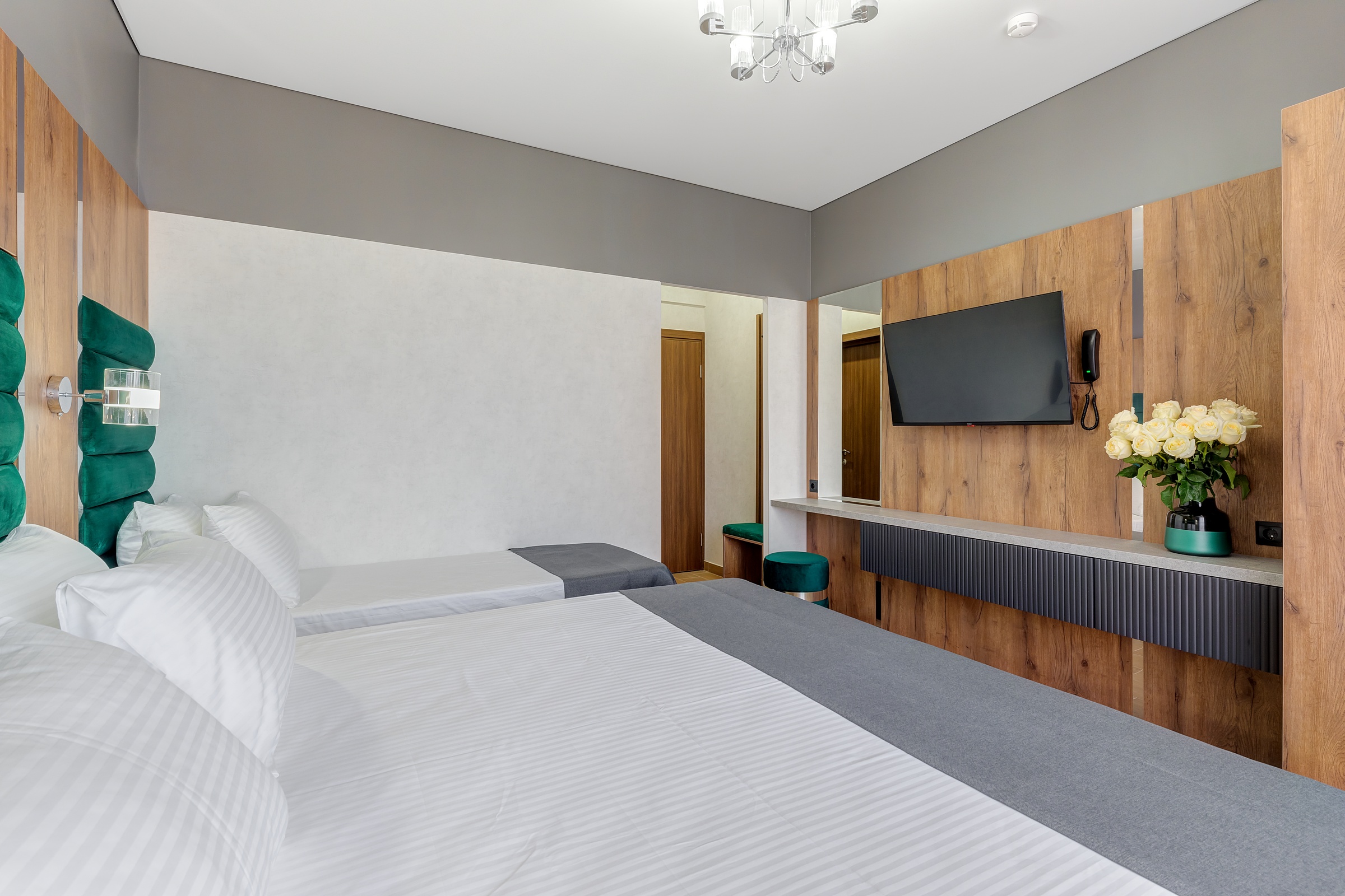 вешалка, зеркало, кровати односпальные /одна двуспальная кровать, кровать односпальная, прикроватные тумбочки, пуфик, стол, шкаф