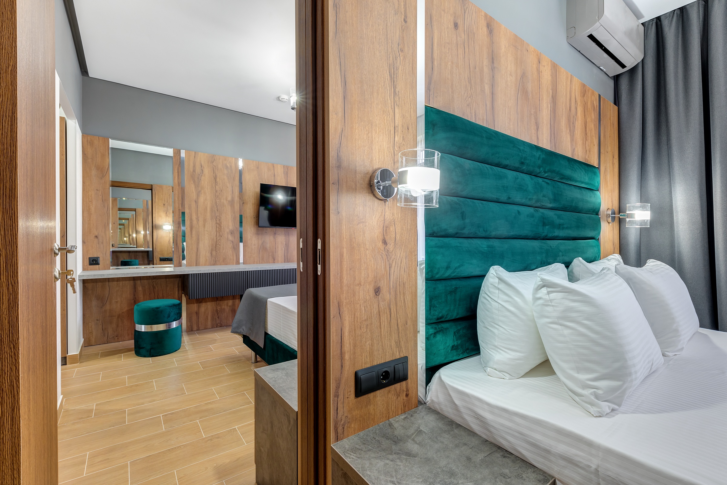 вешалка, зеркало, кровать двуспальная, кровать односпальная, прикроватные тумбочки, пуфик, стол, шкаф