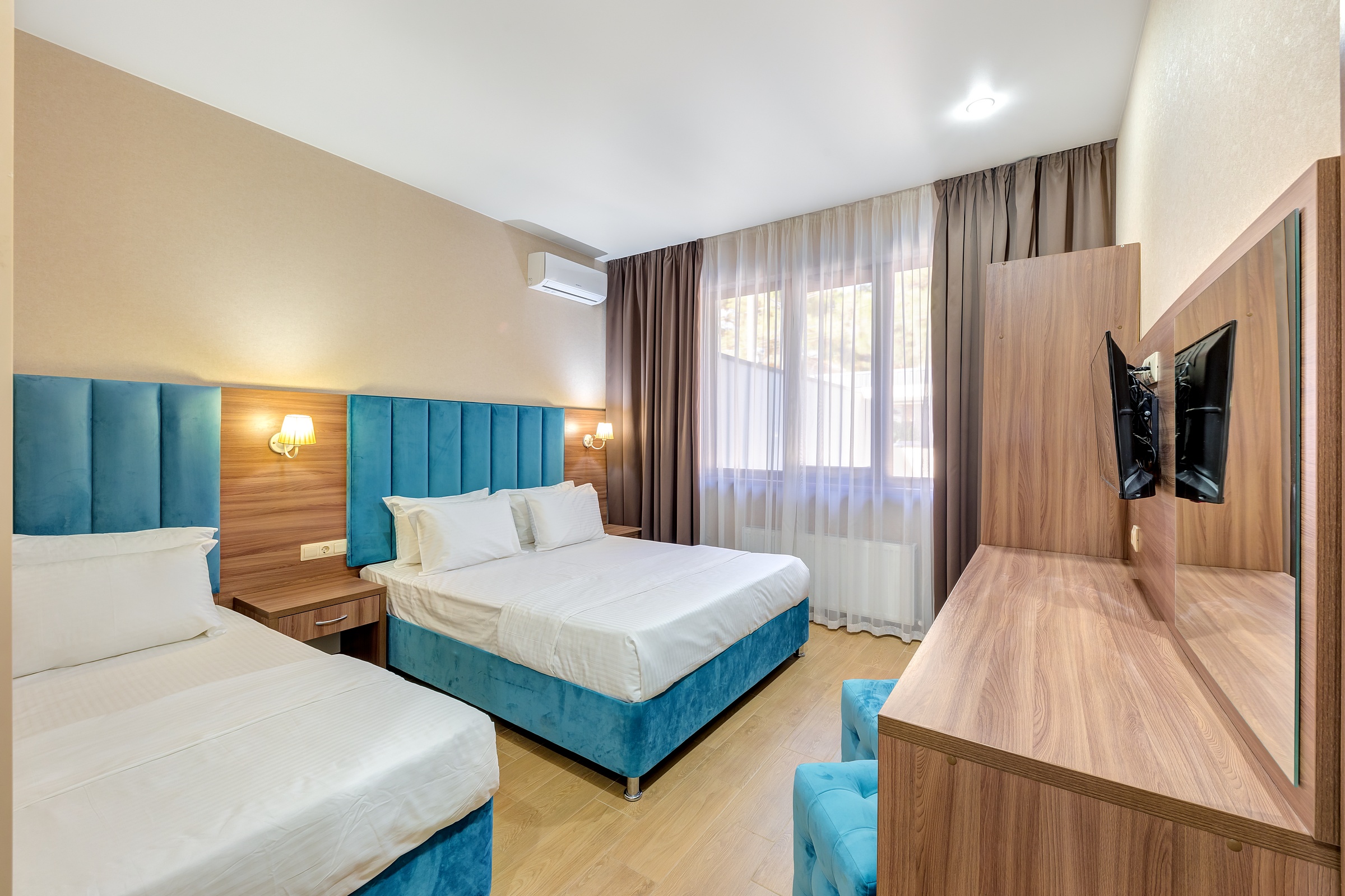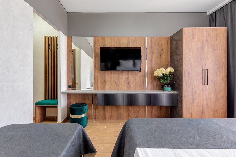 вешалка, диван, зеркало, кровати односпальные /одна двуспальная кровать, прикроватные тумбочки, пуфик, стол, шкаф