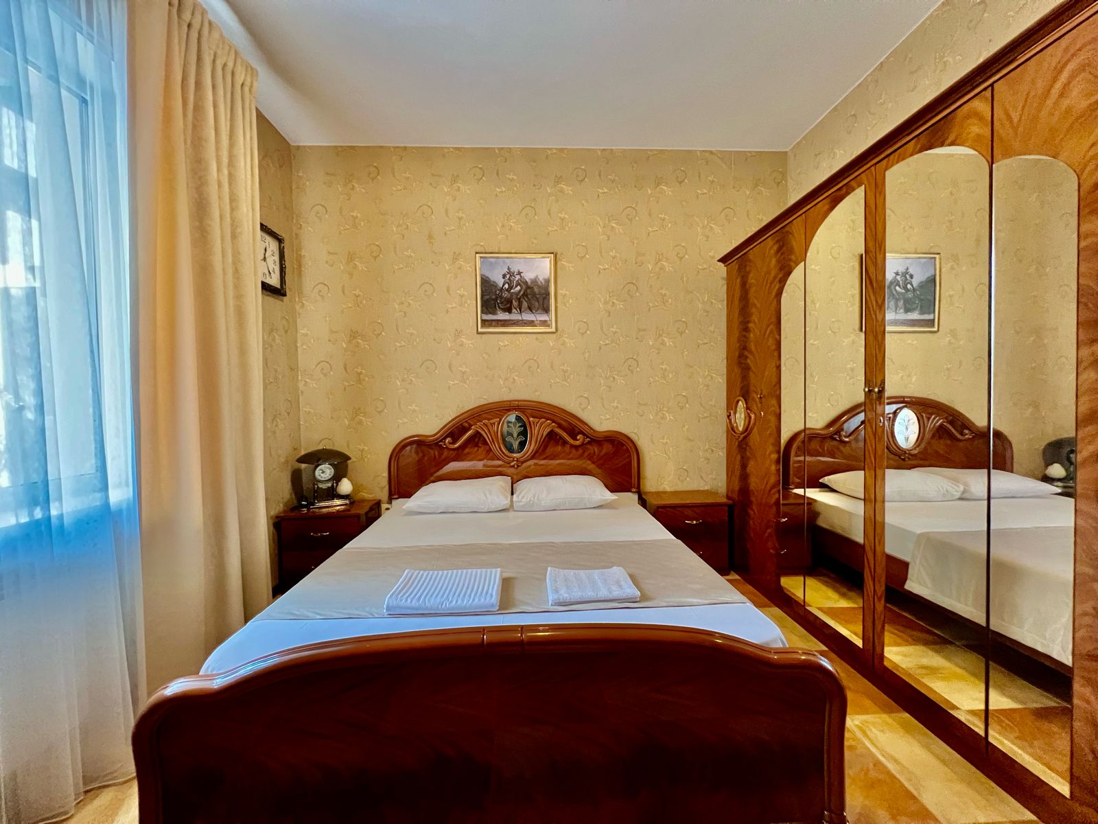 вешалка, диван раскладной, зеркало, кровать двуспальная, прикроватные тумбочки, стол, стул, шкаф
