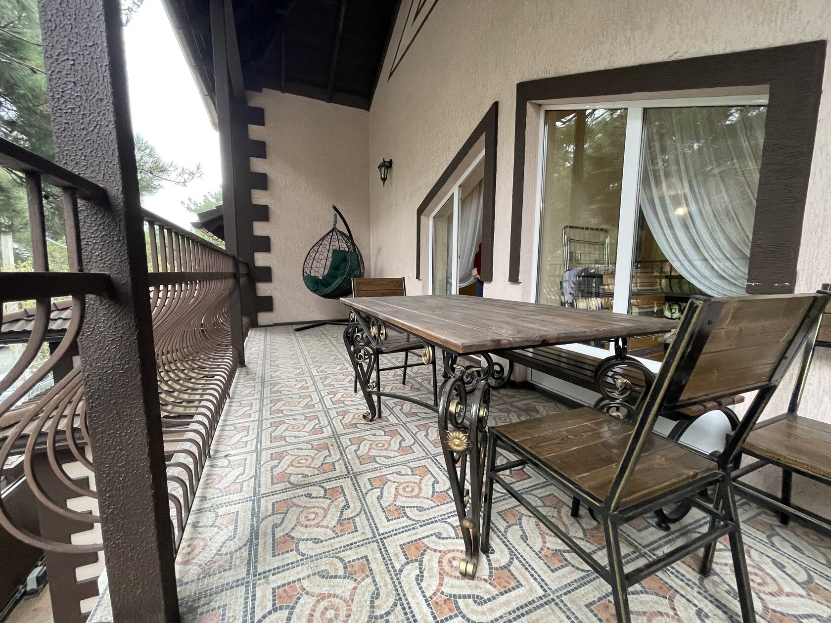 вешалка, диван раскладной, зеркало, кровати односпальные, кровать двуспальная, прикроватные тумбочки, столик журнальный, стол обеденный, стулья, шкаф