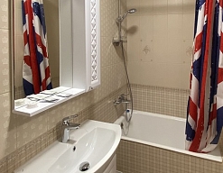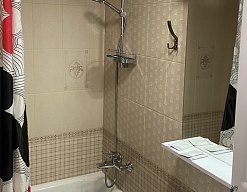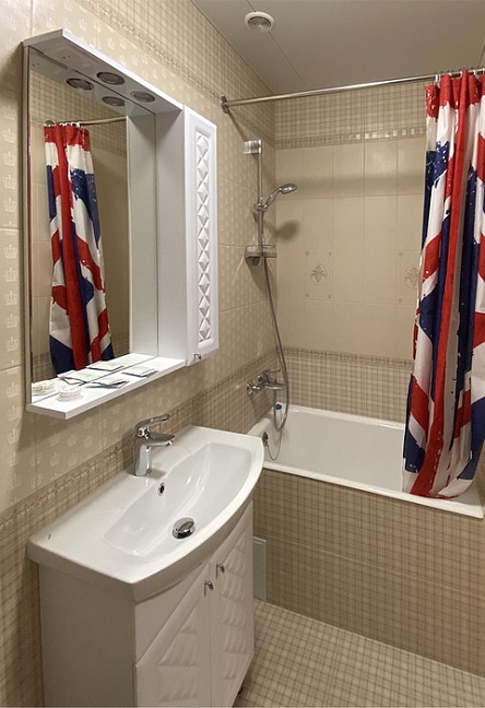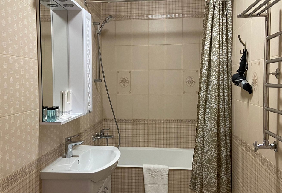 с душем, тапочки, туалетные принадлежности, фен, халат