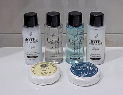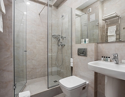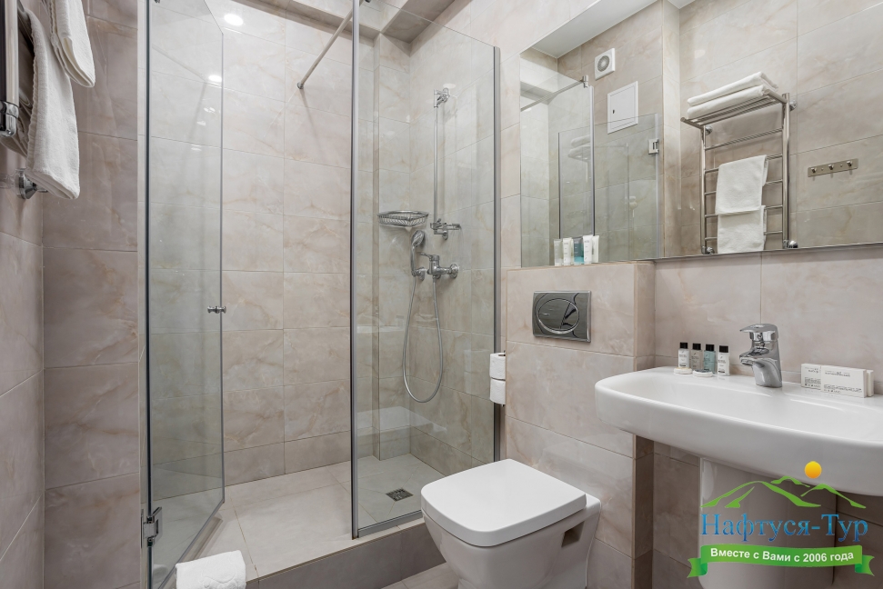 с душевой кабиной, тапочки, туалетные принадлежности, фен