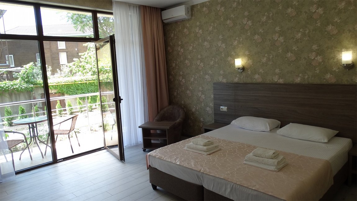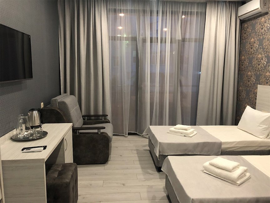 На самолете до аэропорта Адлер, далее на электричке до станции Лазаревская, затем на автобусе №156,157,158,170,67,72,73,77,78,79 до остановки «Рынок», затем пройти 640 м до отеля.