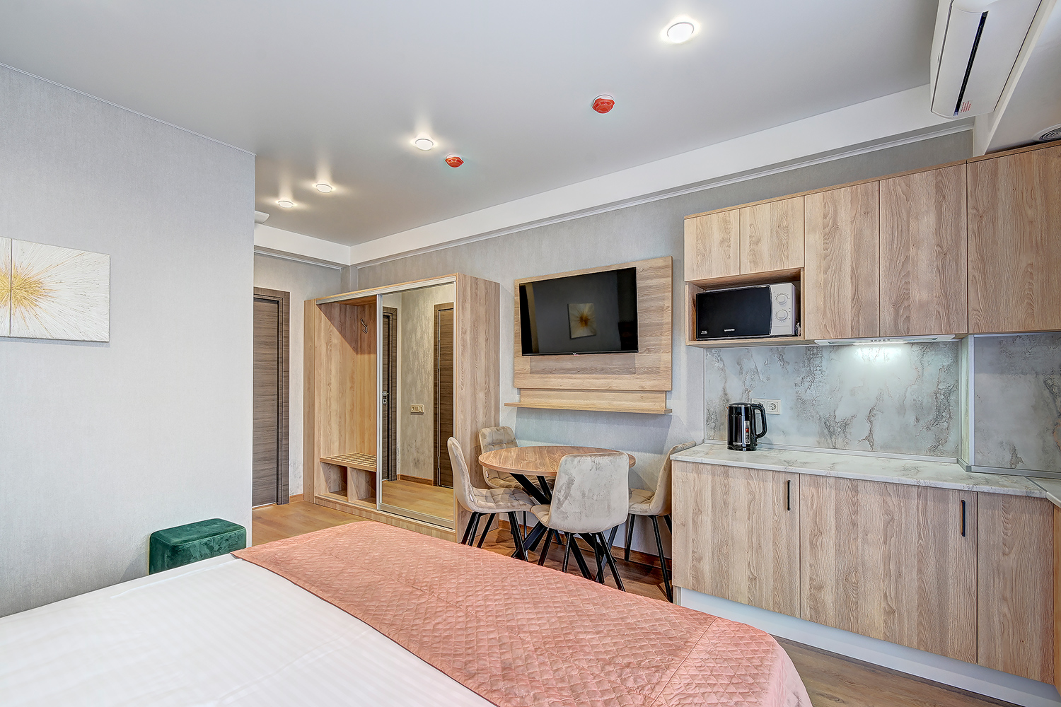 кондиционер, микроволновая печь, мини-холодильник, набор посуды, телевизор ЖК, электрочайник