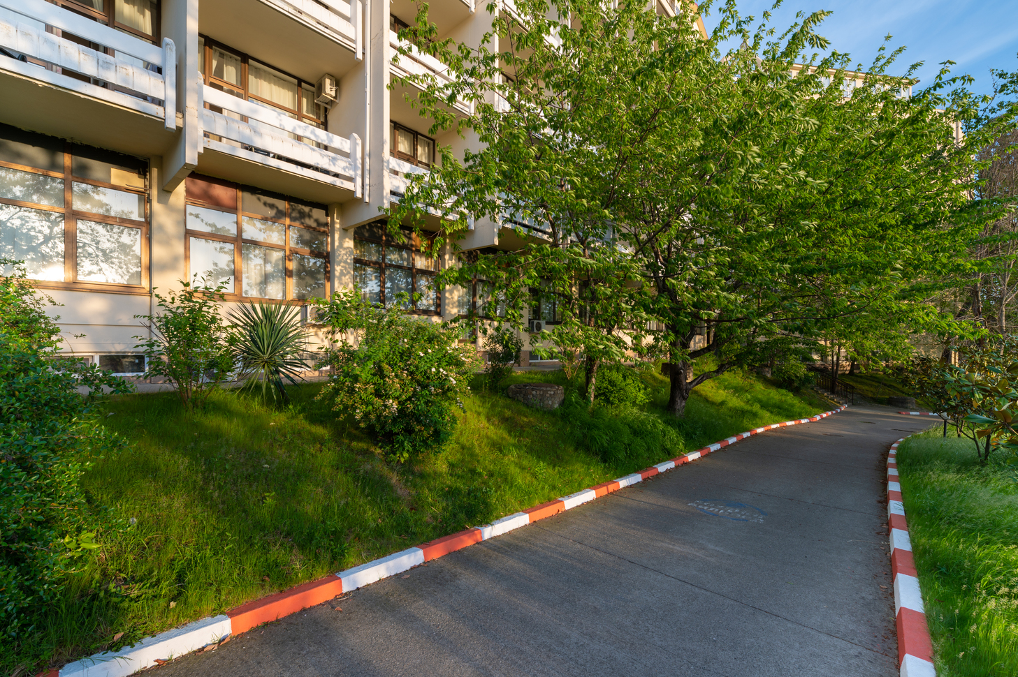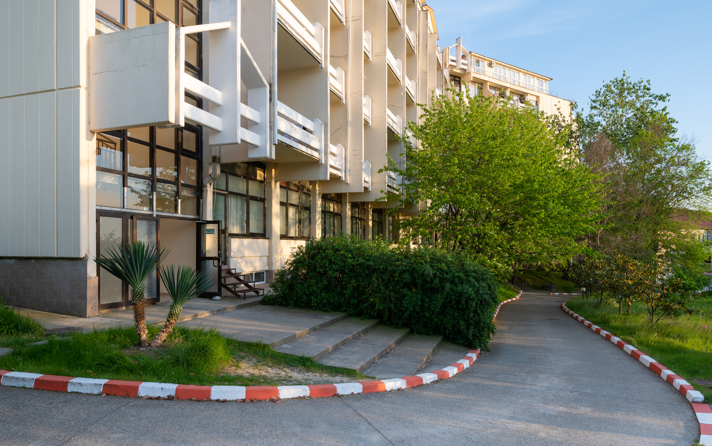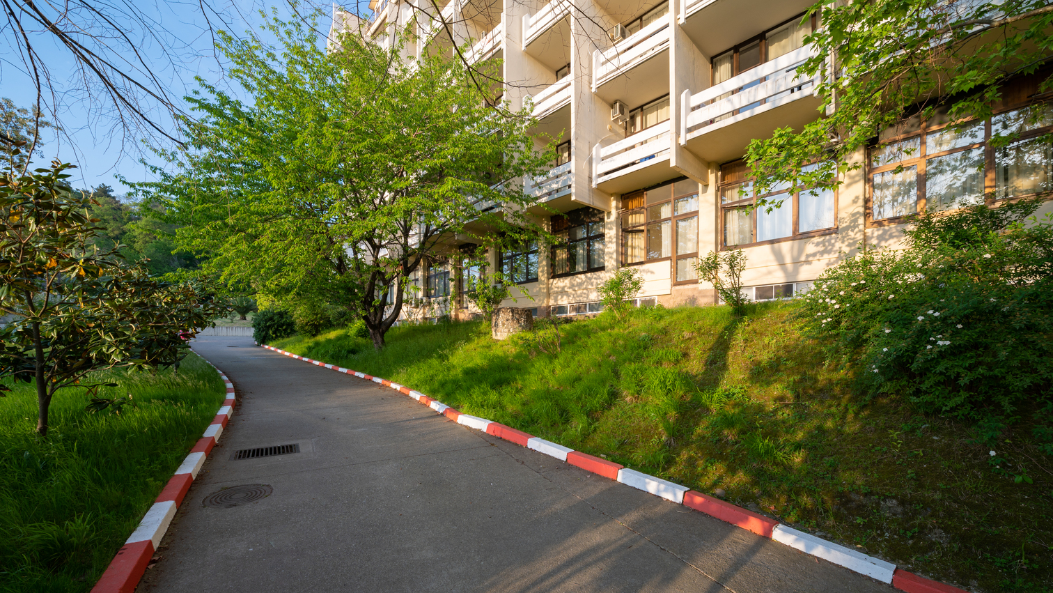 Корпуса отеля расположены на большой охраняемой и живописной территории, утопающей в зелени и редких растениях с аллеей роз. Непривычно большие для Сочи номера, большой бассейн с лежаками,