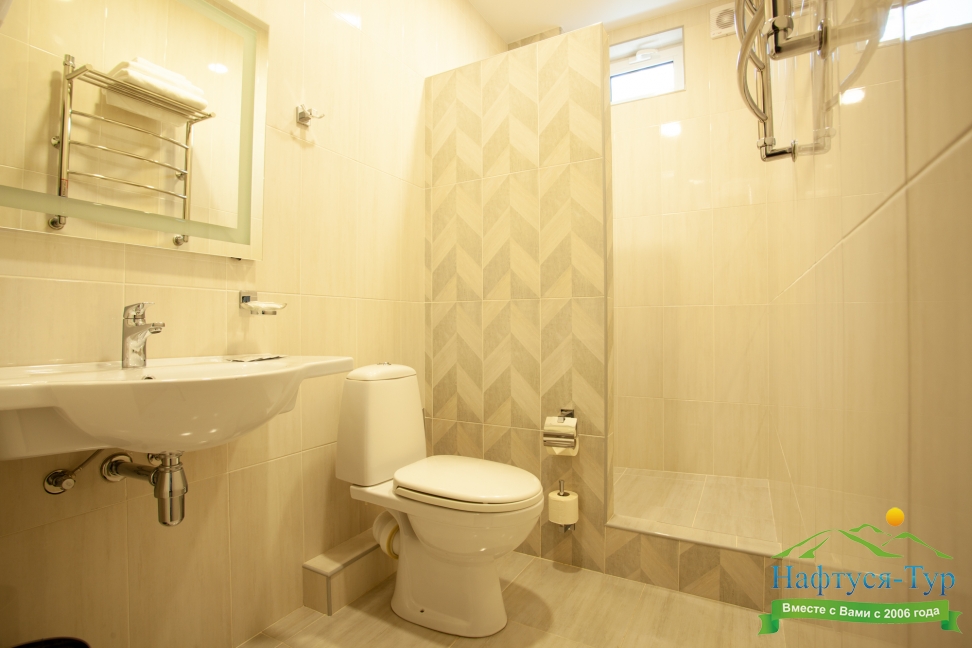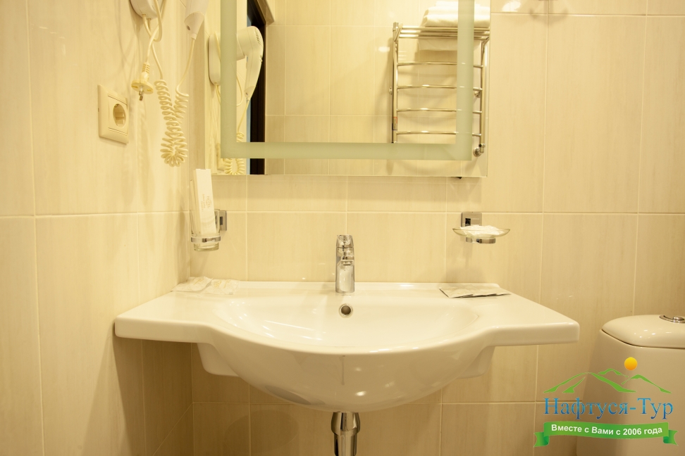 с душем, тапочки, туалетные принадлежности, фен, халат