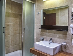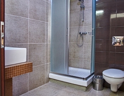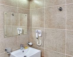 с душевой кабиной, тапочки, туалетные принадлежности, фен