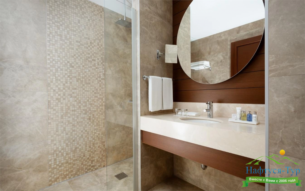с душем, тапочки, туалетные принадлежности, фен, халат