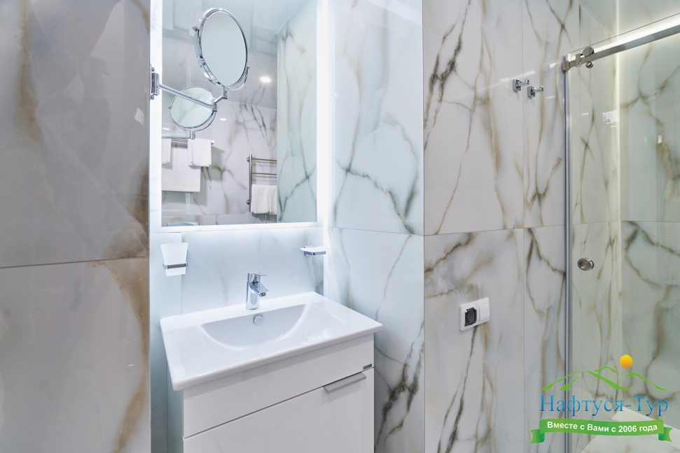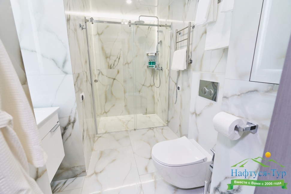 с душем, тапочки, туалетные принадлежности, фен, халат